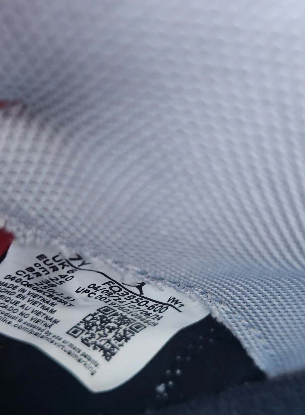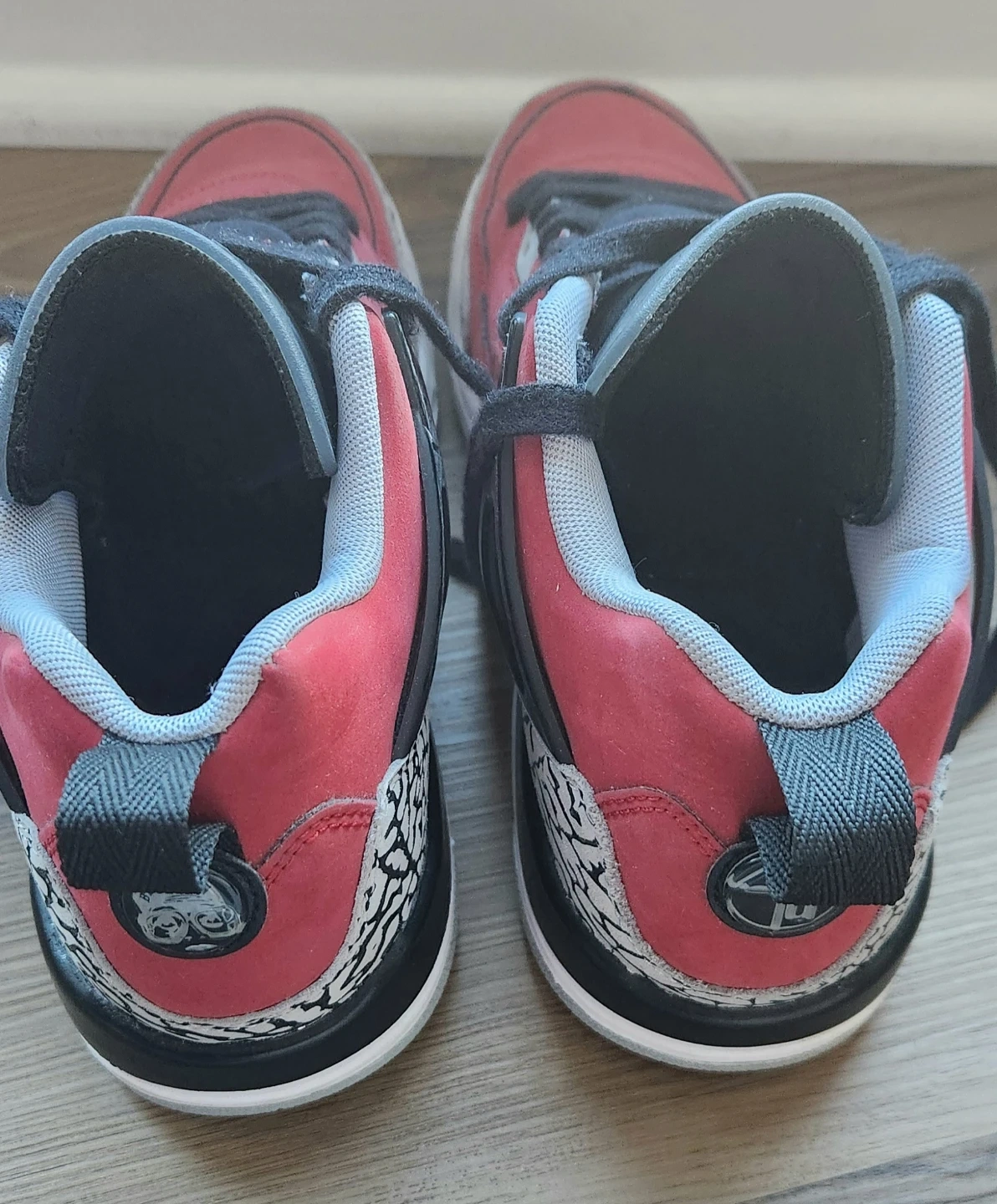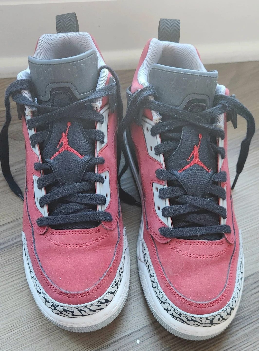 These are Jordan 3 sneakers in a red and black colorway. They're a youth size 7Y (US) or EU 40. Rubber sole with good tread.