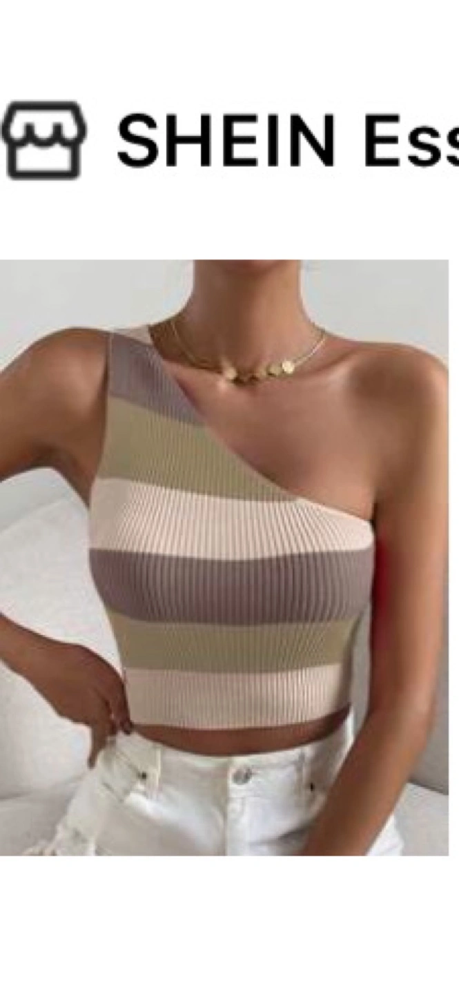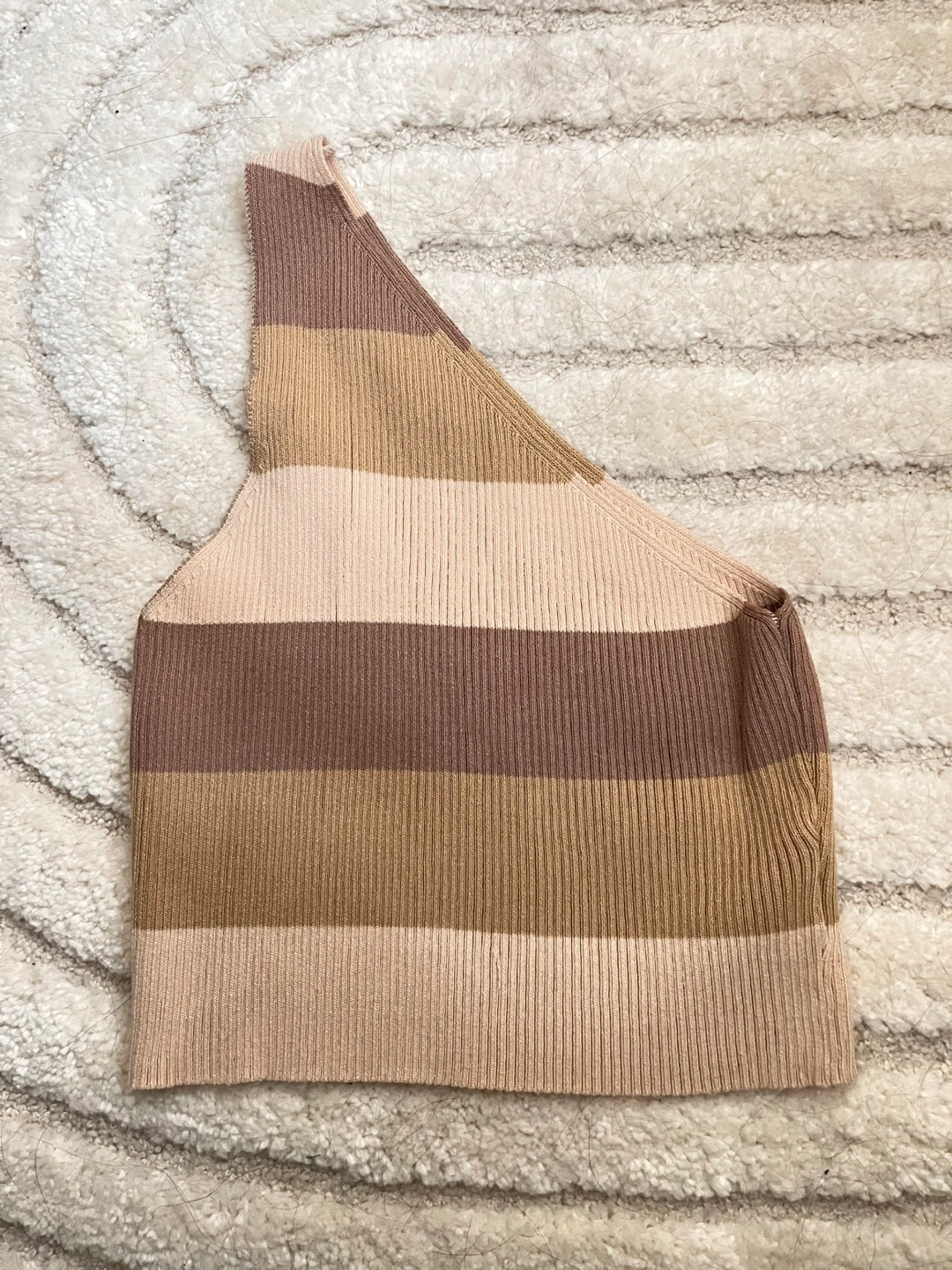 Adorable SHEIN one-shoulder crop top. Features horizontal stripes in neutral colours. Fitted, stretchy knit fabric. Perfect for summer.
