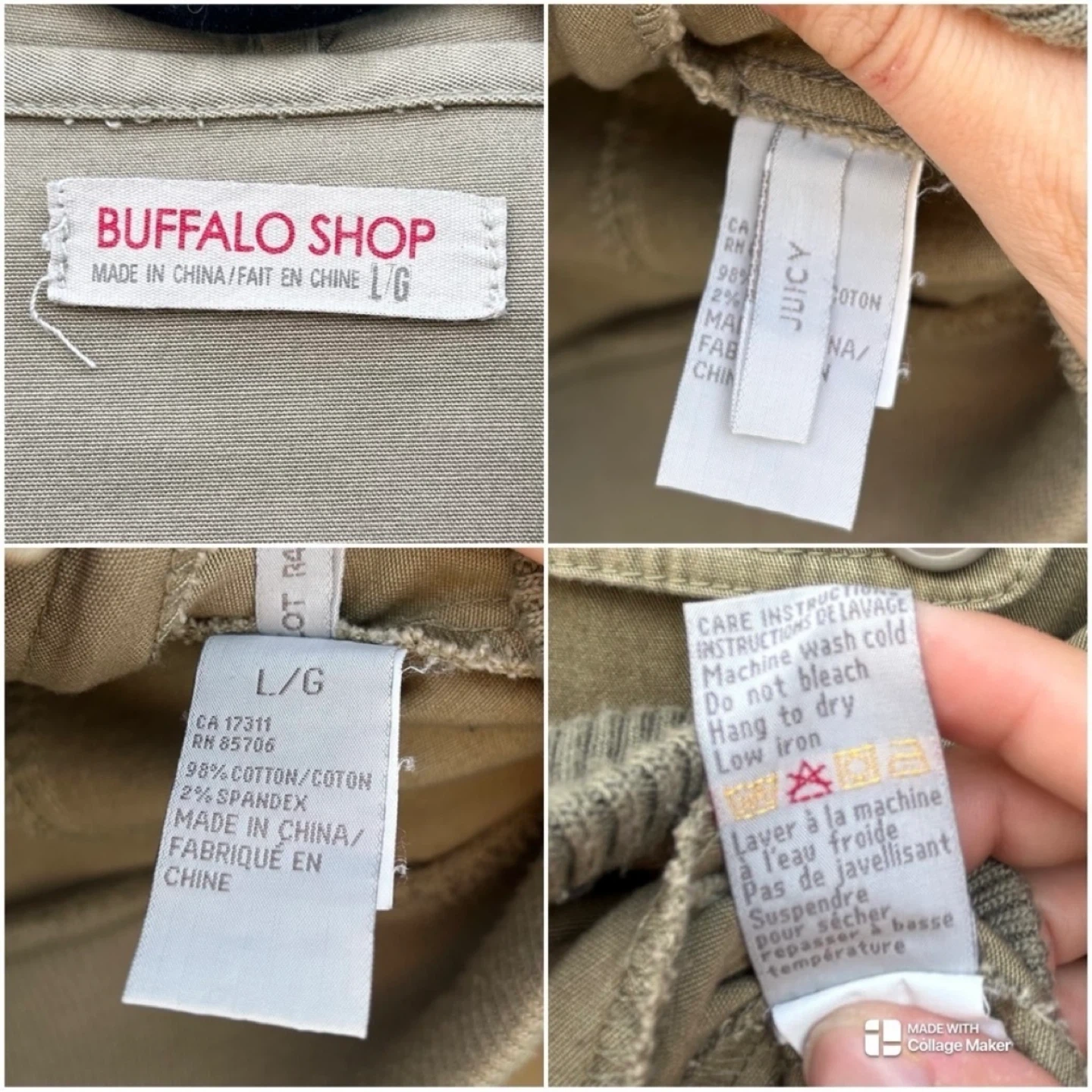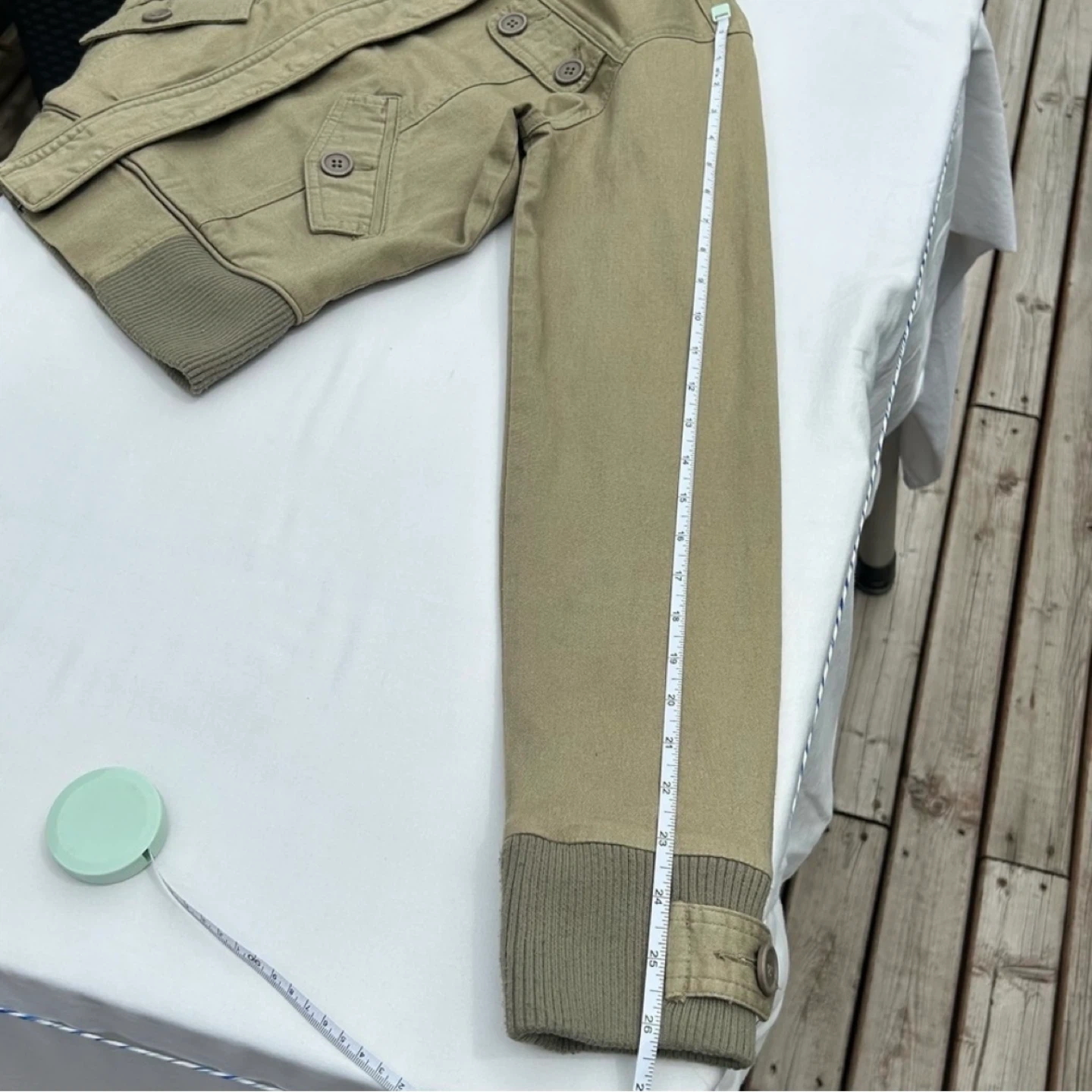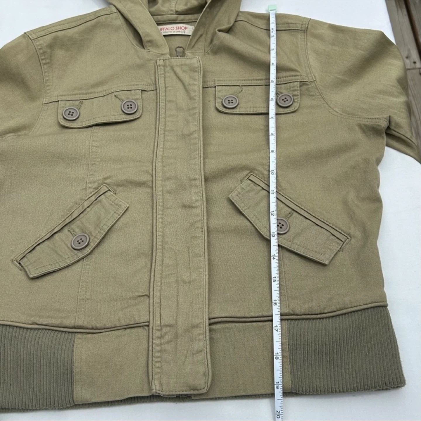 122Olive green canvas utility jacket from Buffalo Shop. Cropped. Hooded. Long Sleeves with ribbed cuffs. Worn only a few times. Tag says size L but it fits more like a size S/M. See photos for measurements. Cross posted. Winnipeg - Pick up only (Located 2 blocks west of Polo Park). Shipping options available through other platforms message me for details.
