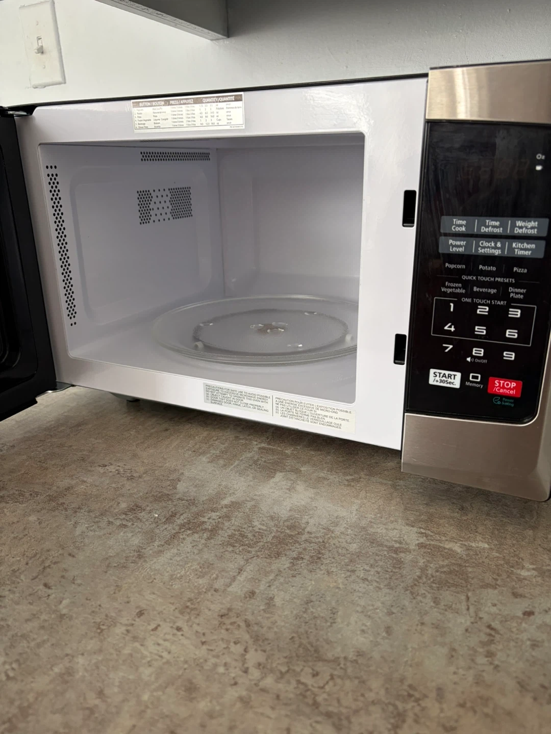 This is a Toshiba stainless steel microwave oven. It includes a glass turntable. Quick touch presets for popcorn, potato, and pizza are available.