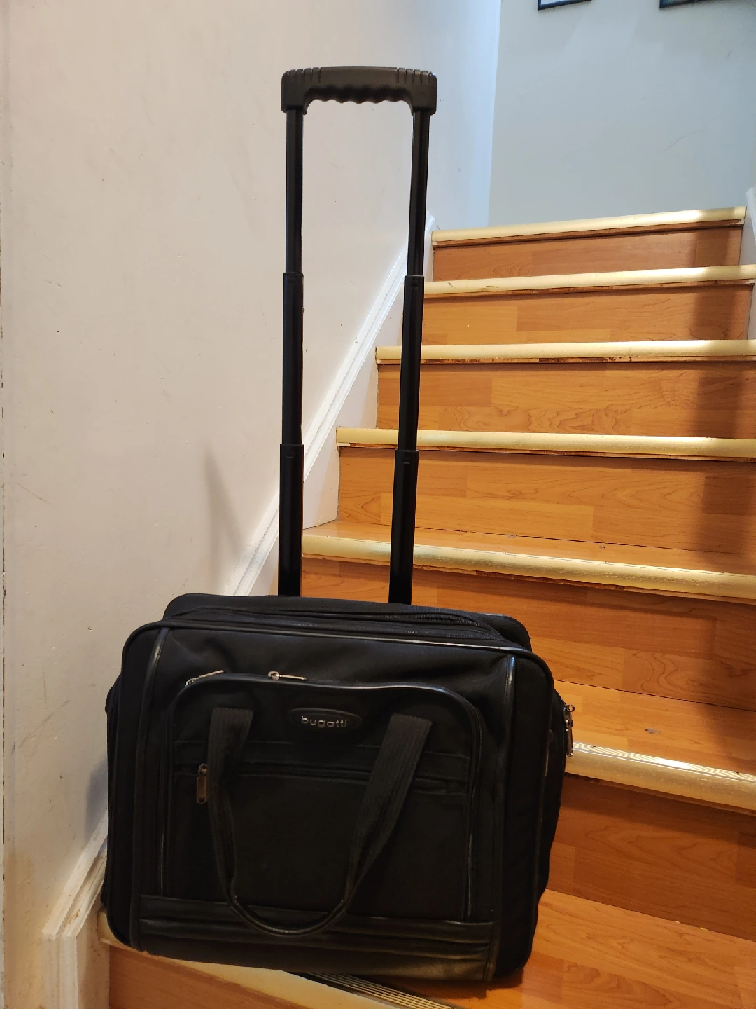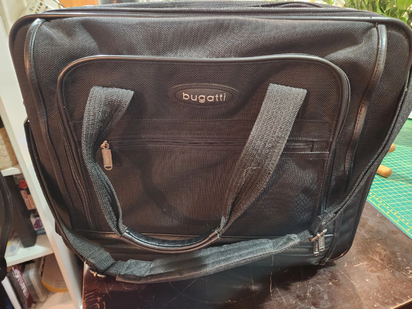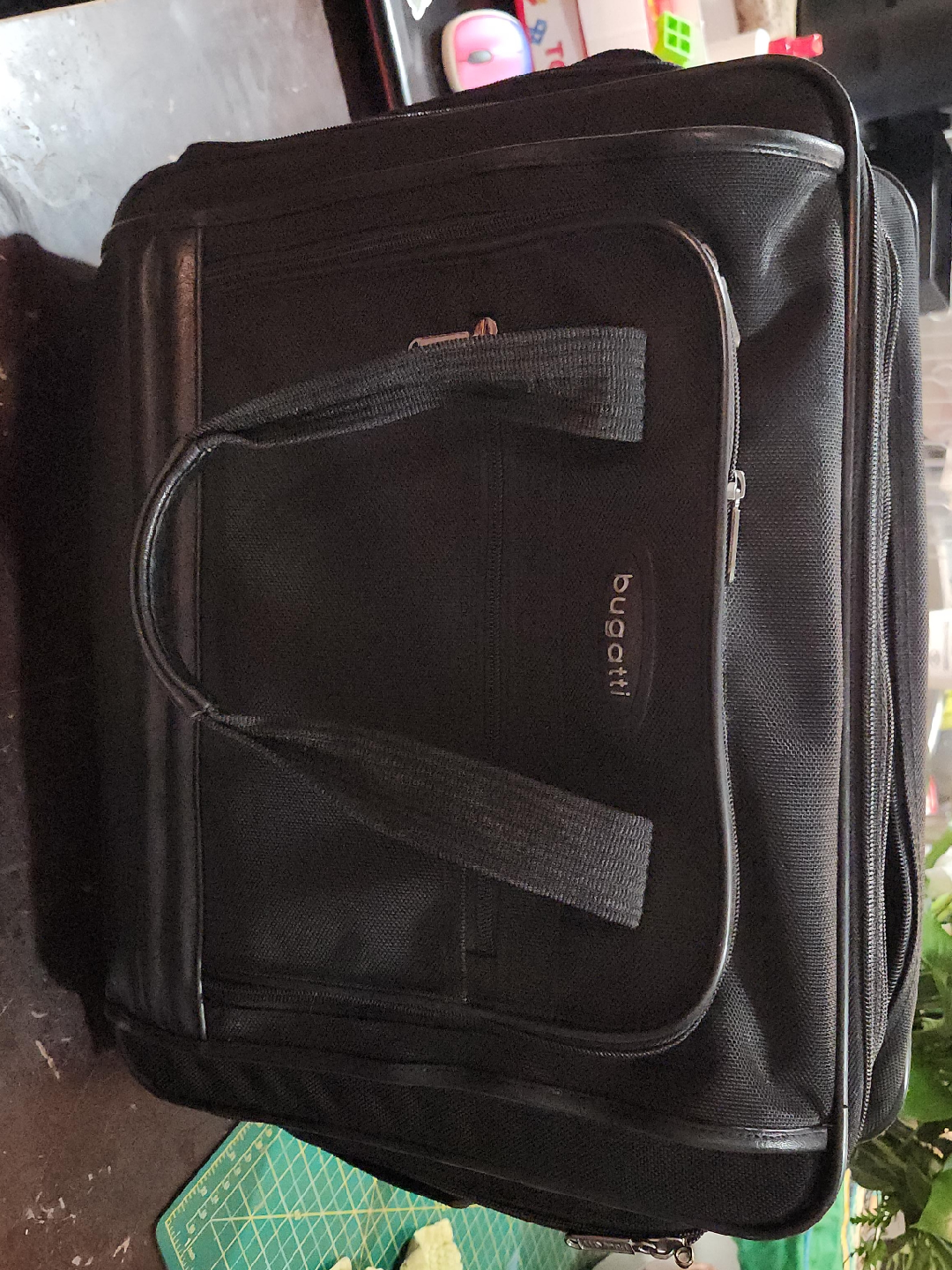 Selling a Bugatti rolling carry-on bag/briefcase in black. Only very minor scuffs. Lots of compartments to keep you organized, extendable gandle and sgoulder strap. Fits in the carry on requirements of all major airlines while having the space.for anything you need. Smoke free and Pet Friendly Home