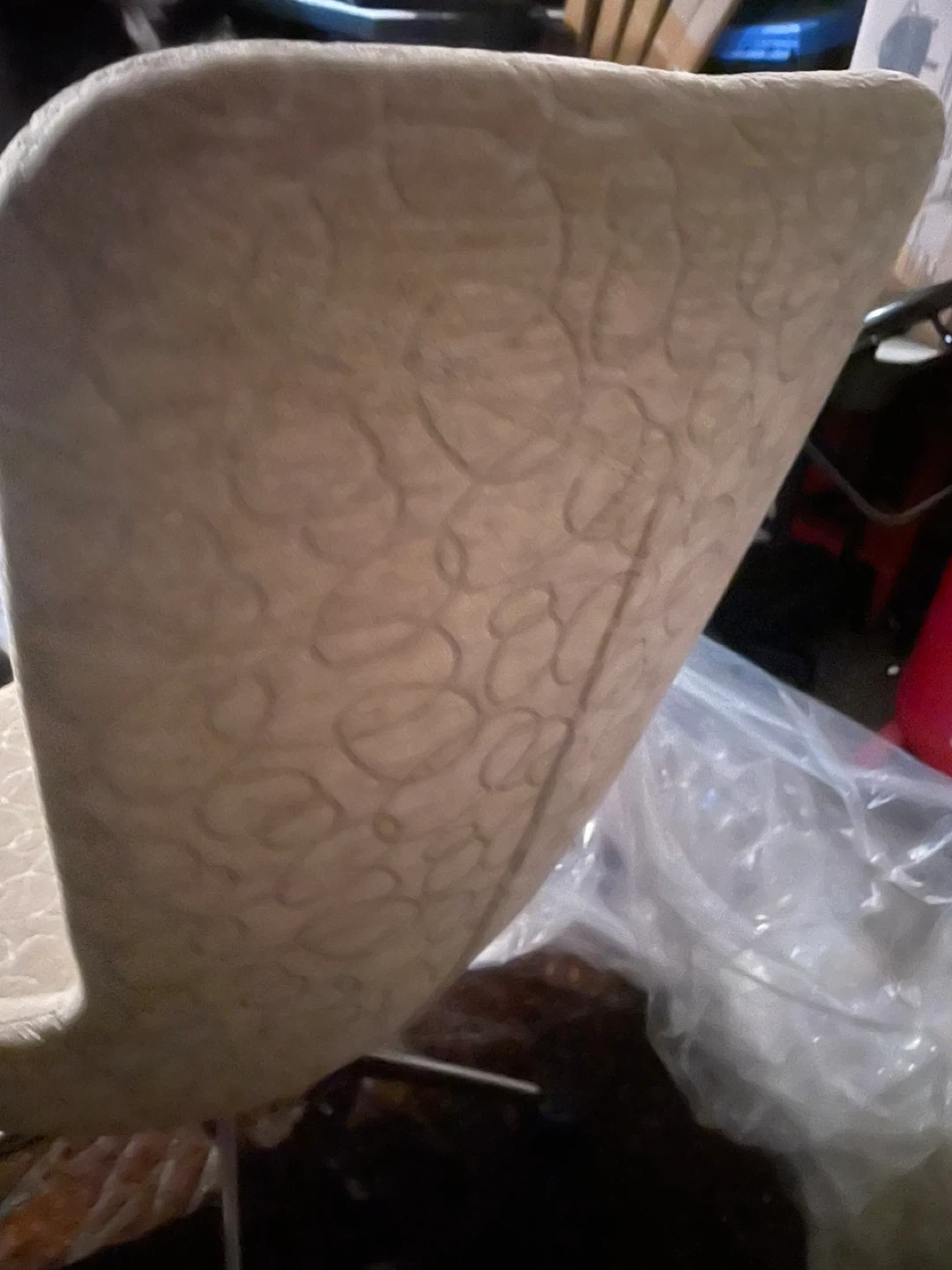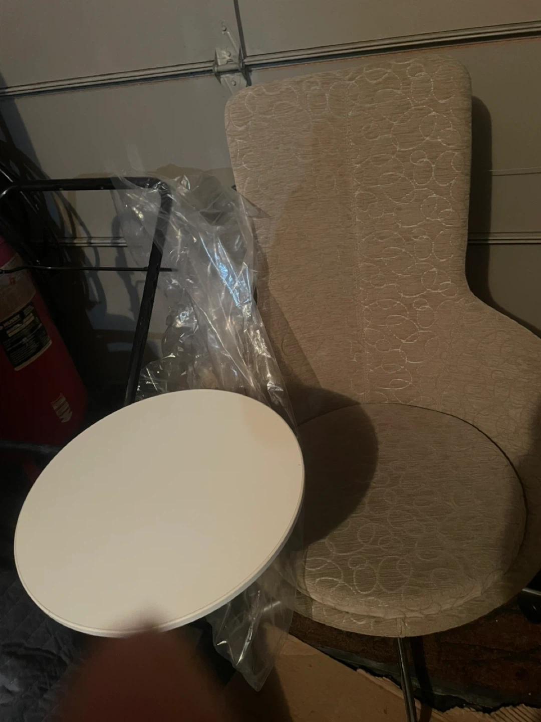 Selling a new beige accent high back chair with a unique patterned design. Has a detachable side table.