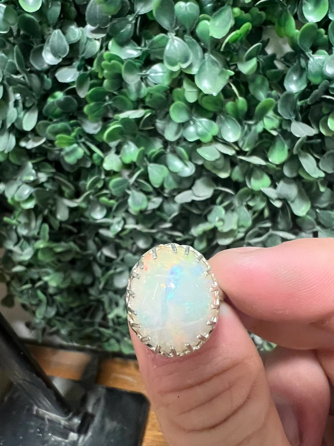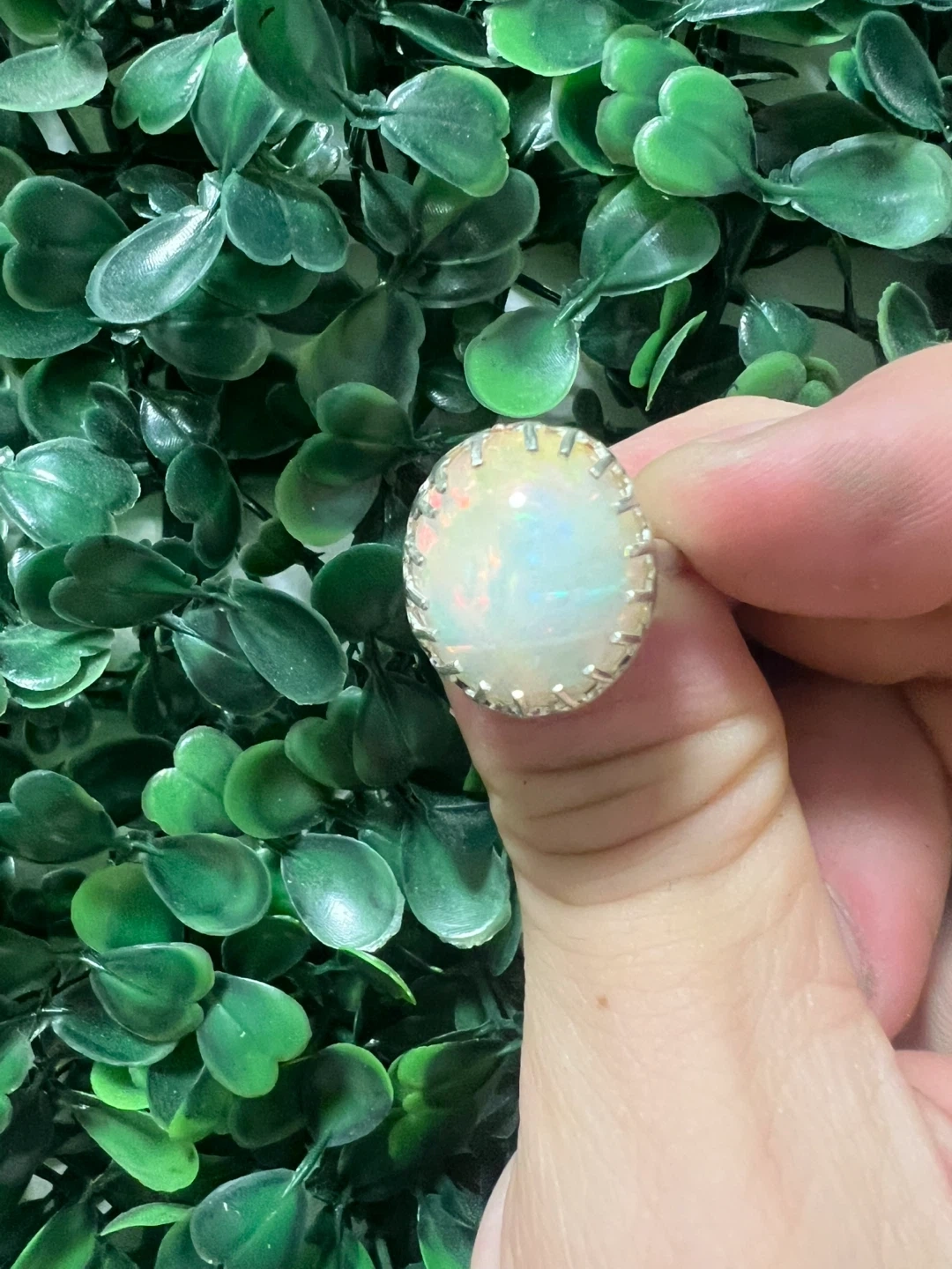 A stunning natural Welo Opal loose collector's stone set in a ring. It's a 9.48ct oval cabochon with a white, green, and red play of colour. Transparency is transparent to translucent, and it's cut very well! This unique piece would make a wonderful addition to any jewellery collection.