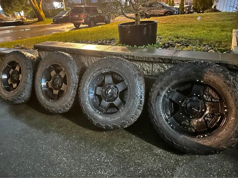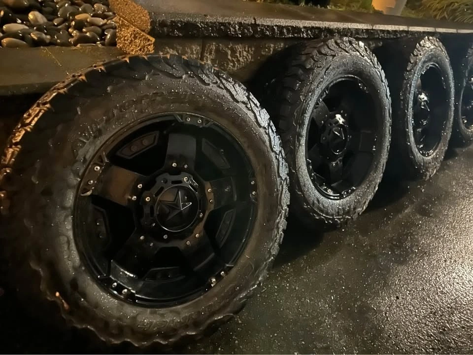 These are 20-inch Rockstar rims with an 8-bolt pattern, fitted with BF Goodrich KO2 tires. They came off of a Dodge and have at least one good season left on the tires, possibly more.