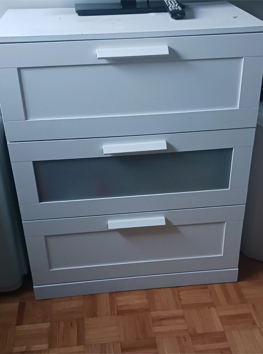 White 3-drawer dresser with one frosted glass drawer front. It's a great storage solution for any room. Its simple design fits most decors.