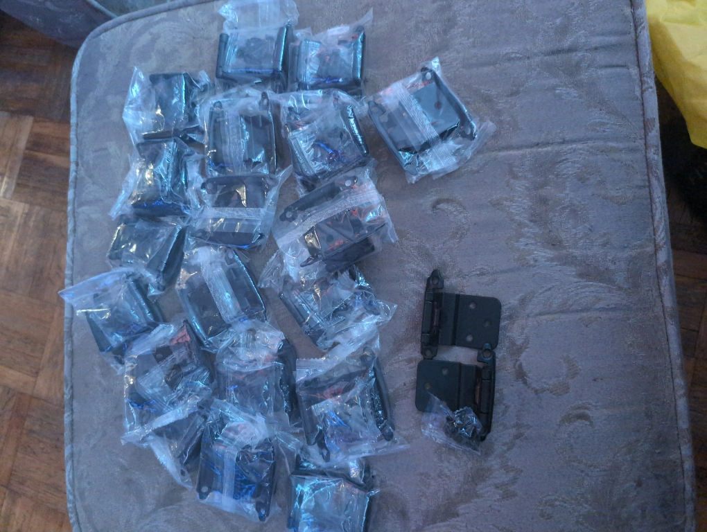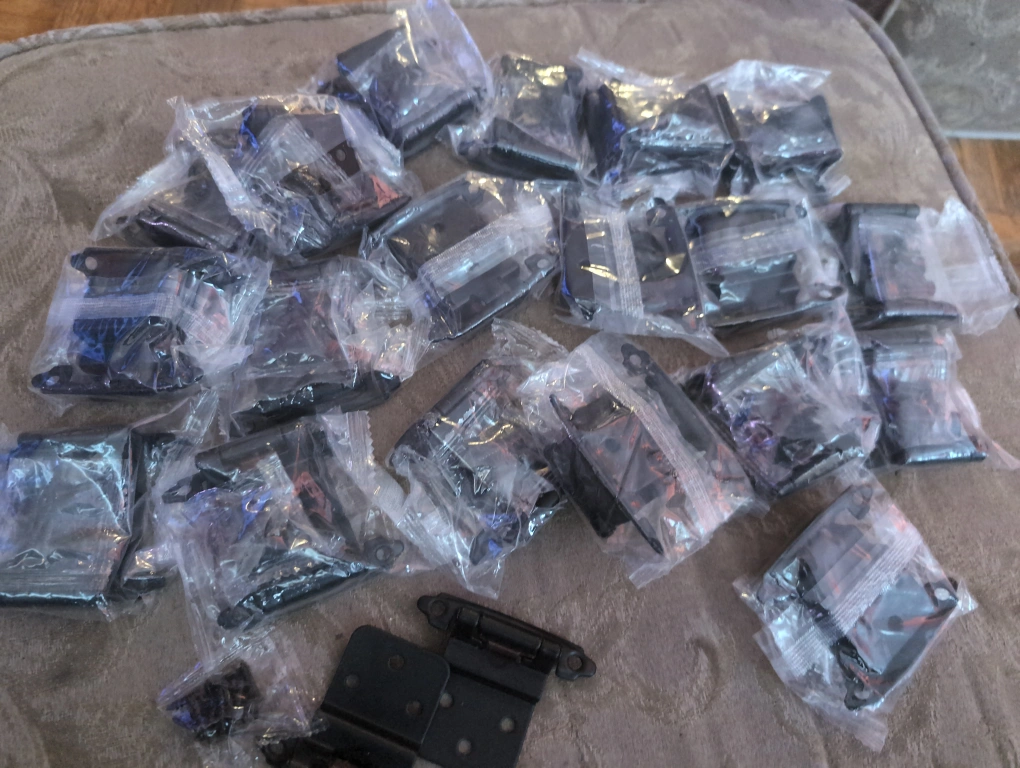 13915+ black cabinet hinges, individually packaged. Some hinges are outside of packaging. Screws included. Great for renovations or repairs. 20 pcs