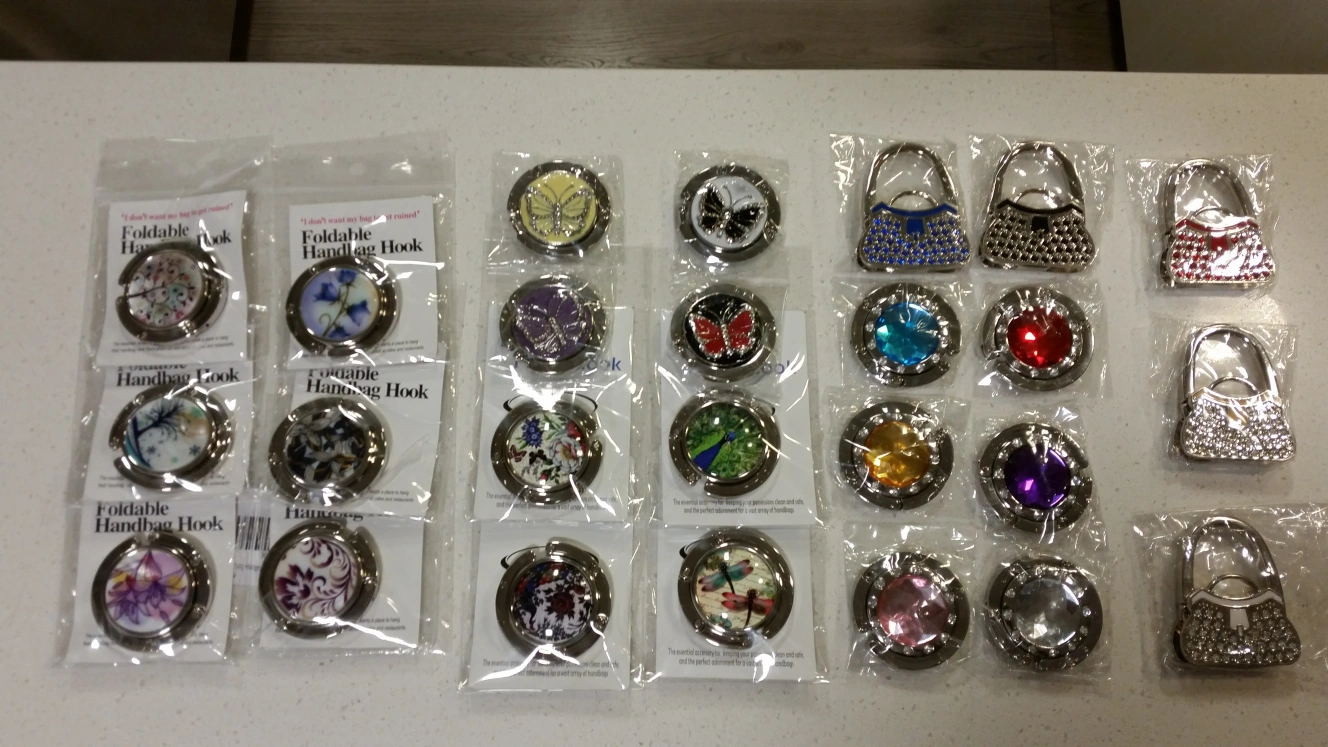 Variety of designs. Silver metal hooks with different coloured gems and patterns. Individually packaged. Perfect for resale.