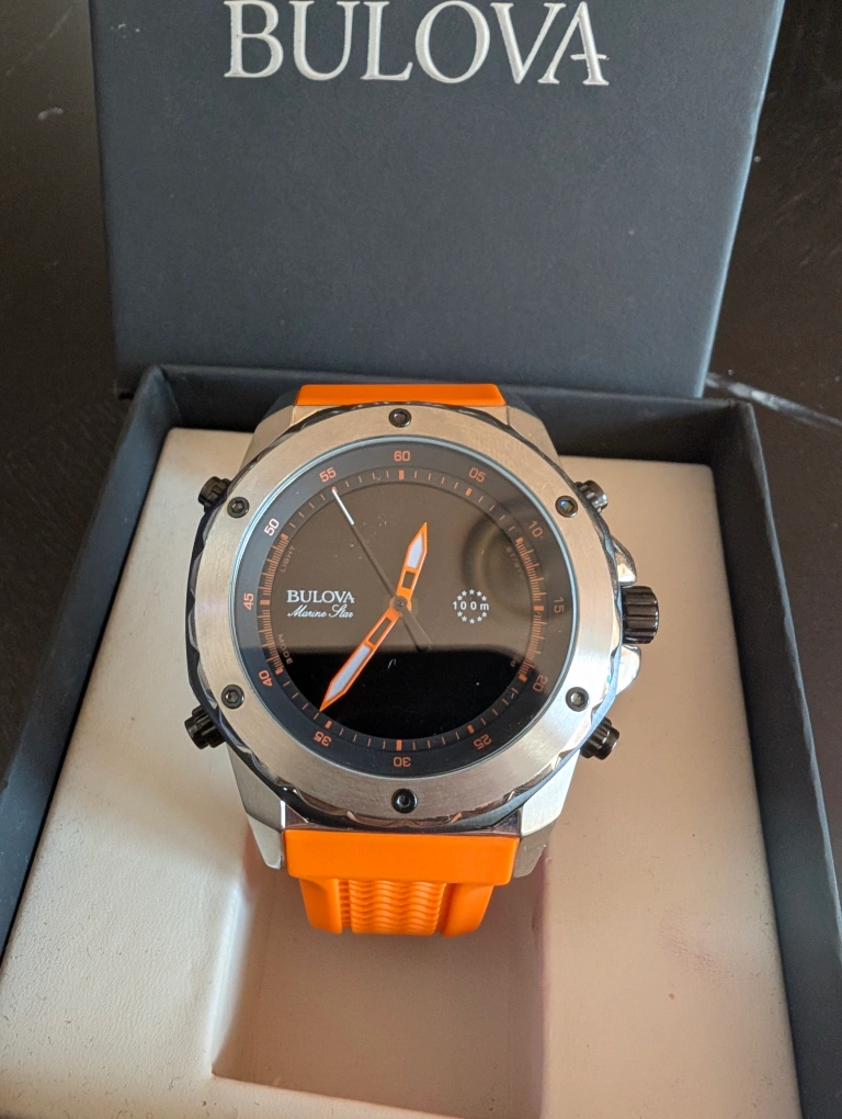 101Selling a Bulova Marine Star watch with a vibrant orange band! This watch is in great condition and comes with its original box. It's a stylish and eye-catching piece, perfect for adding a pop of colour to your wrist. Check out the photos for a closer look!