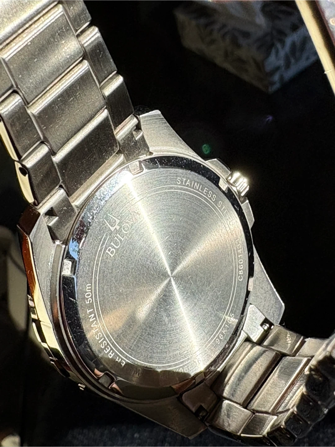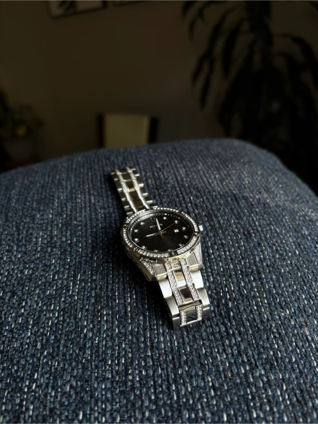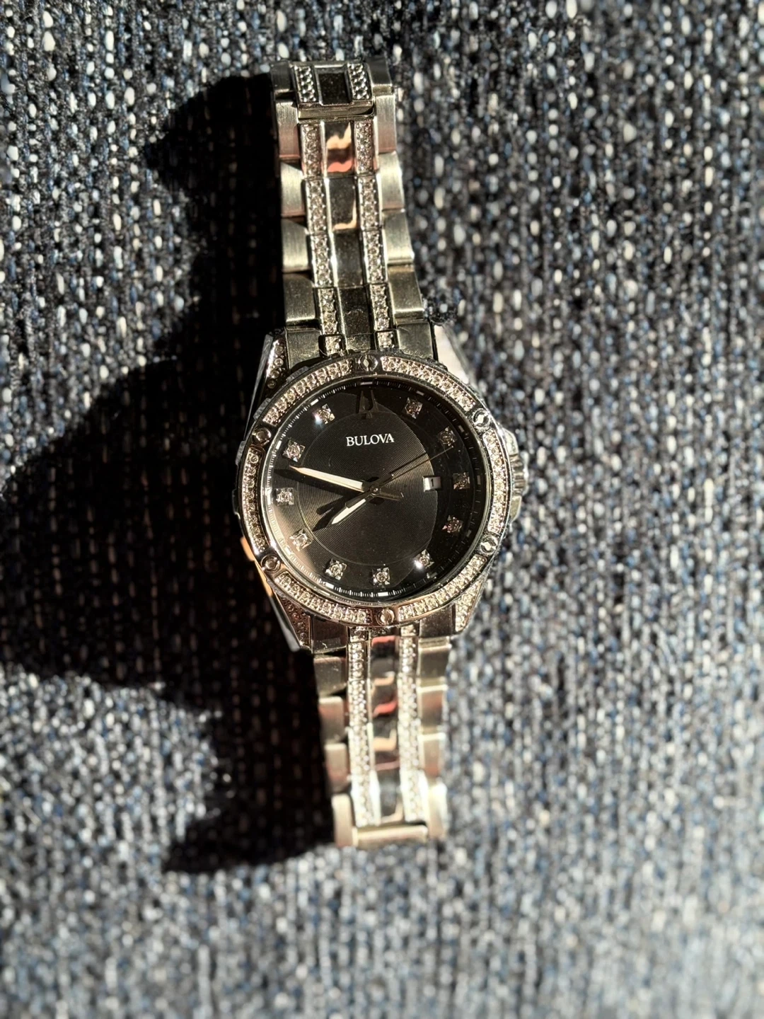 Bulova Men's Crystal Stainless Steel Watch and Matching Bracelet Set. No box. 43 mm stainless steel case with a black dial that showcases silver-tone hands. 11 crystal indices and date display at 3 o'clock. Crystal accented bezel. Complete look with a coordinating crystal adorned stainless steel bracelet. Water resistant up to 30 meters. Comes with extra links to adjust watch to fit. Could benefit from a polish and quartz movement battery, but otherwise good condition. Brand new would cost $850, but I'm selling for $500. Which is $350 off. You can pick this up in the Edmonton area.
