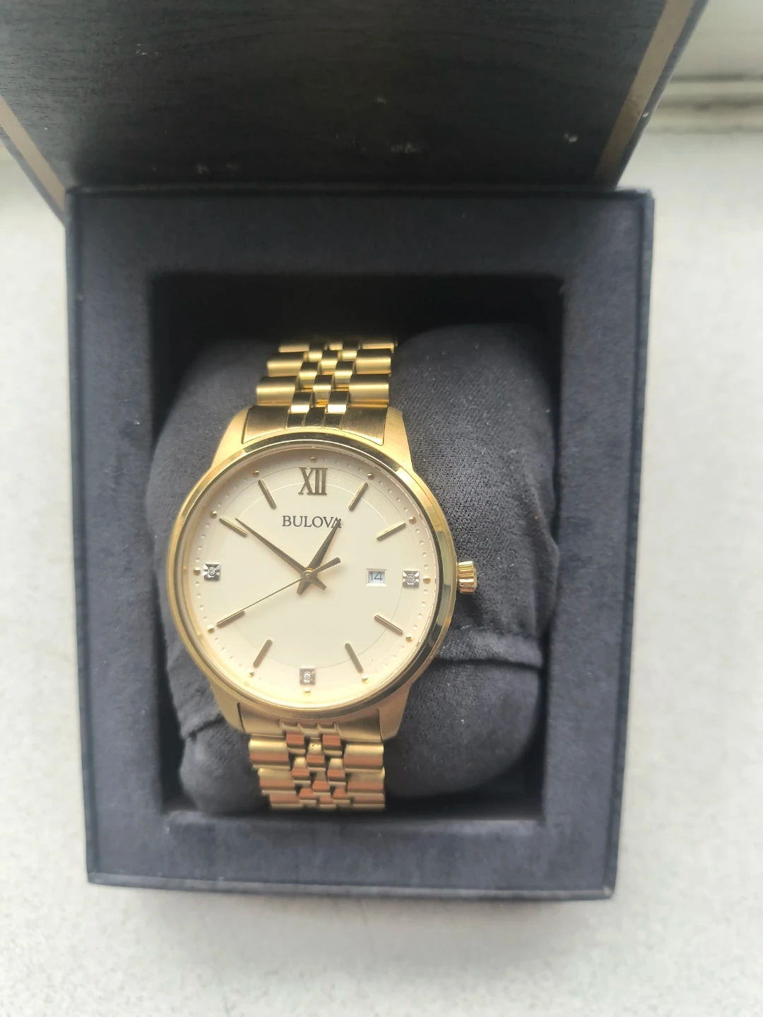 60Selling a Bulova men's watch in gold. It's in great condition and comes with the original box. The receipt shows it was purchased on 2023 September 23 from Macy's. Originally bought for $276.34