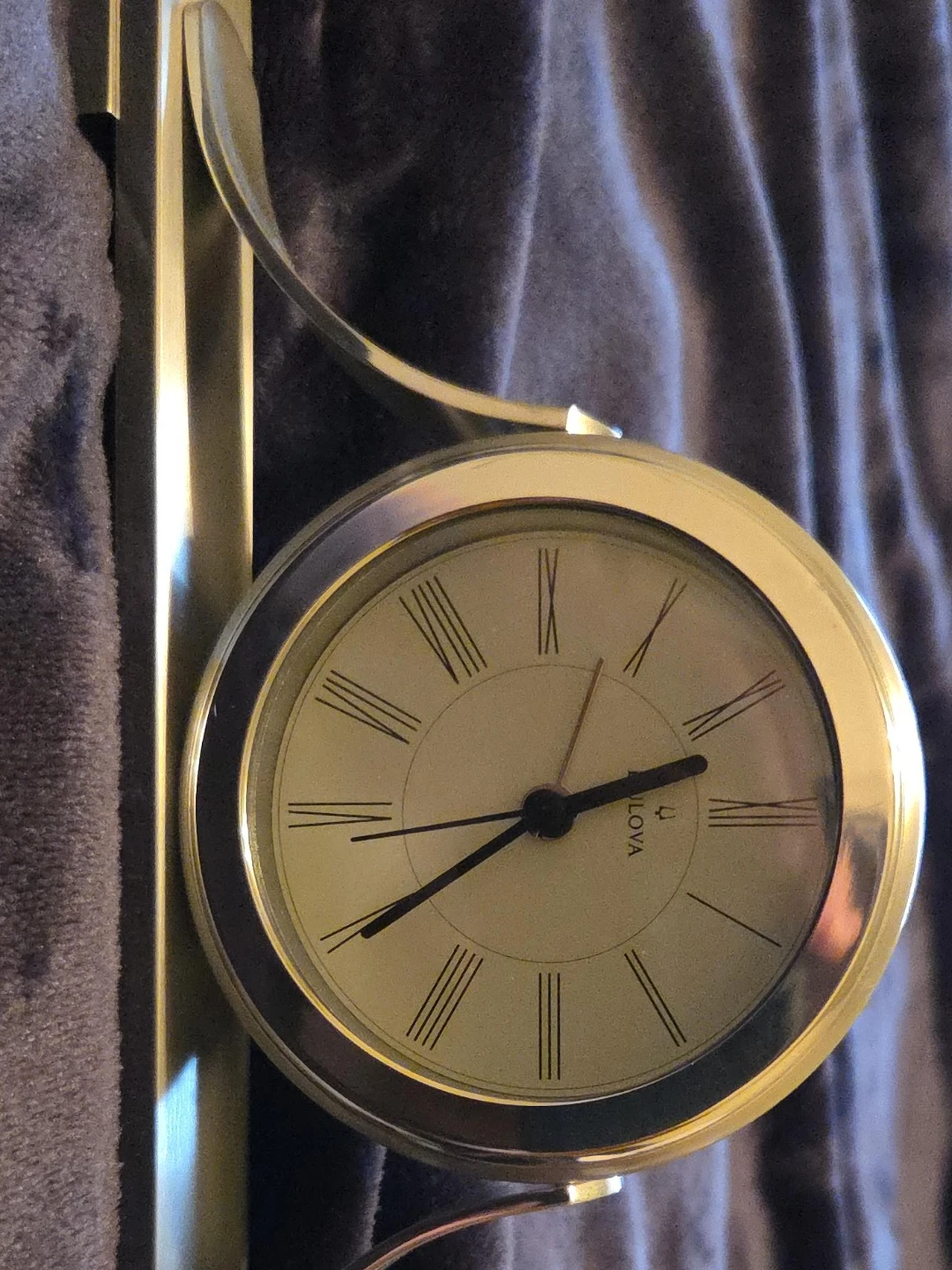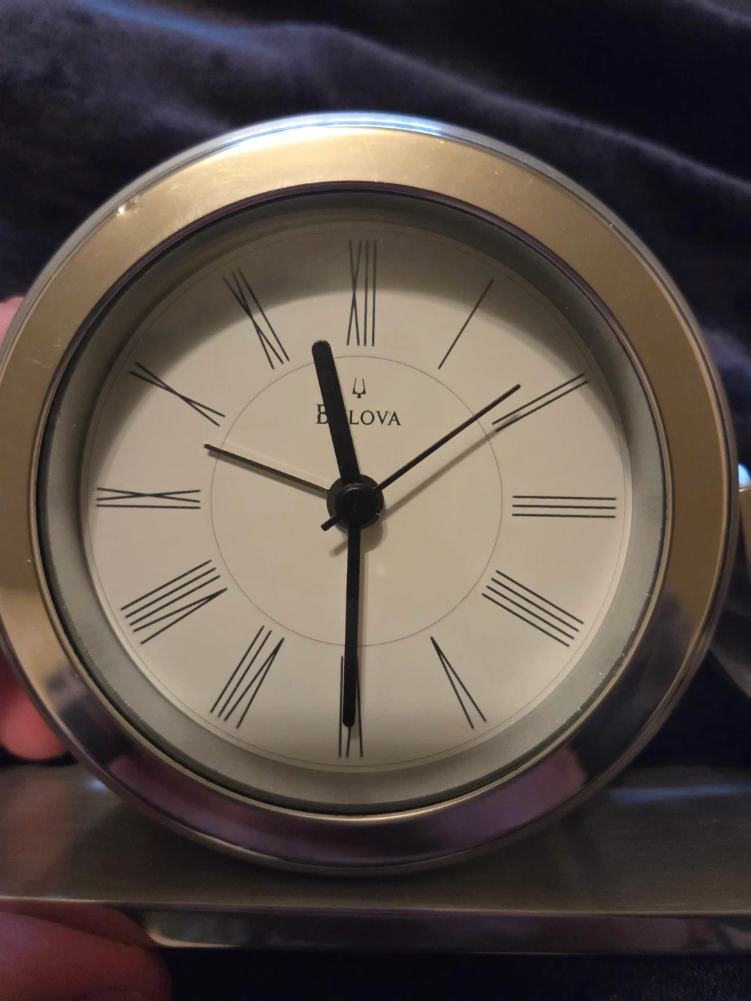 60Selling a Bulova table clock in great condition! It has a silver finish and a classic design that would look great in any room. It's perfect for a desk, shelf, or bedside table. Also has an alarm function option.