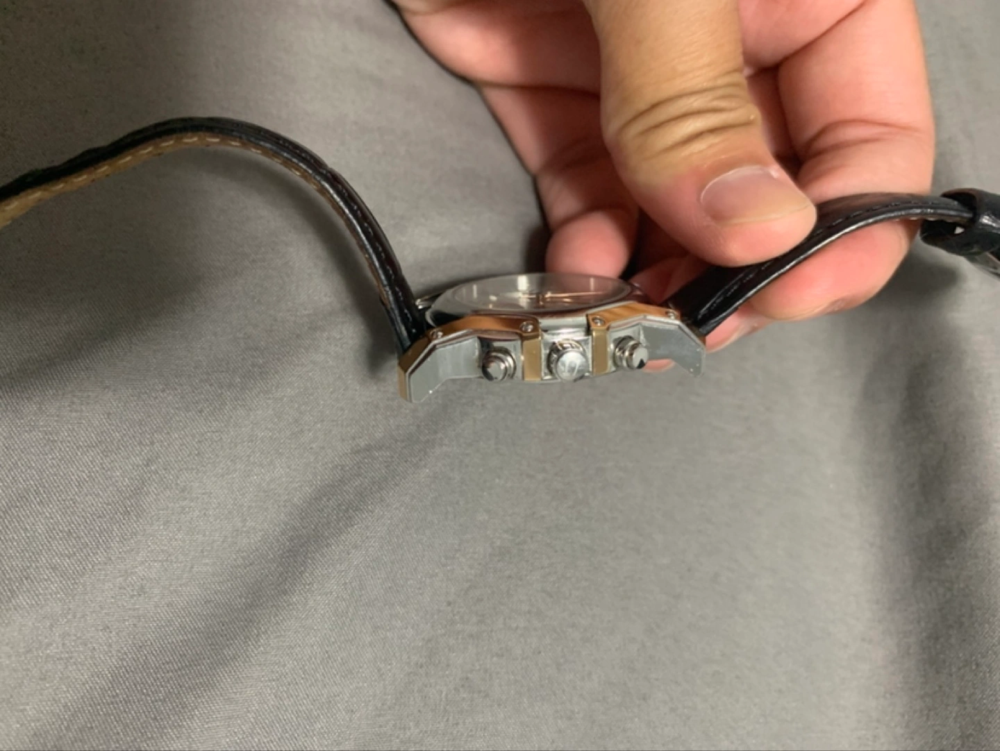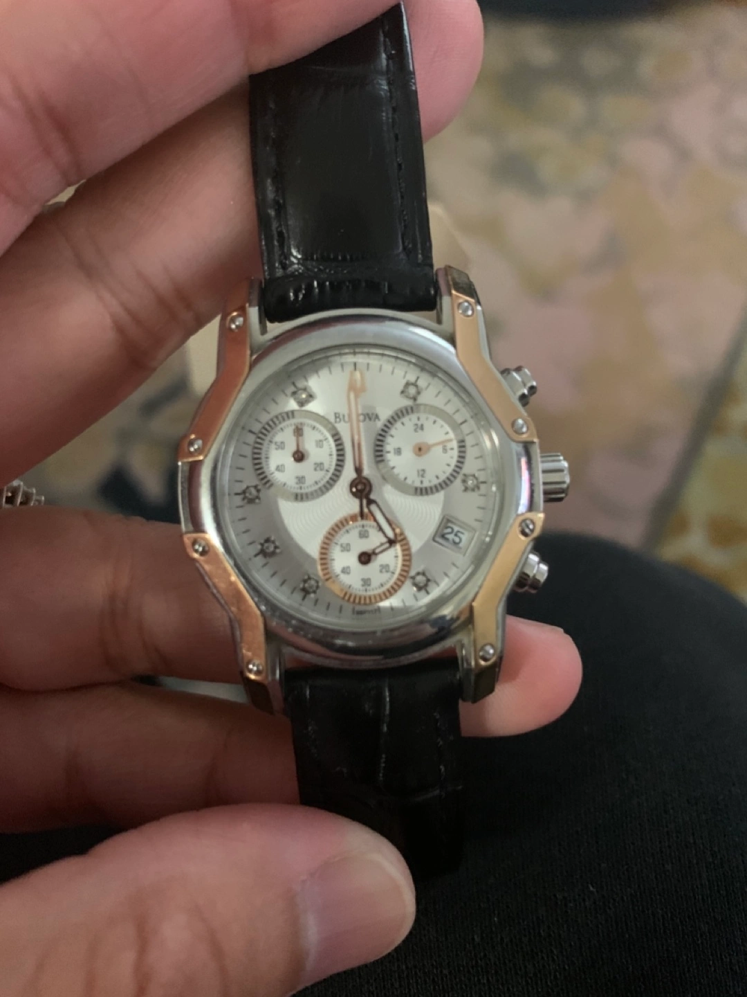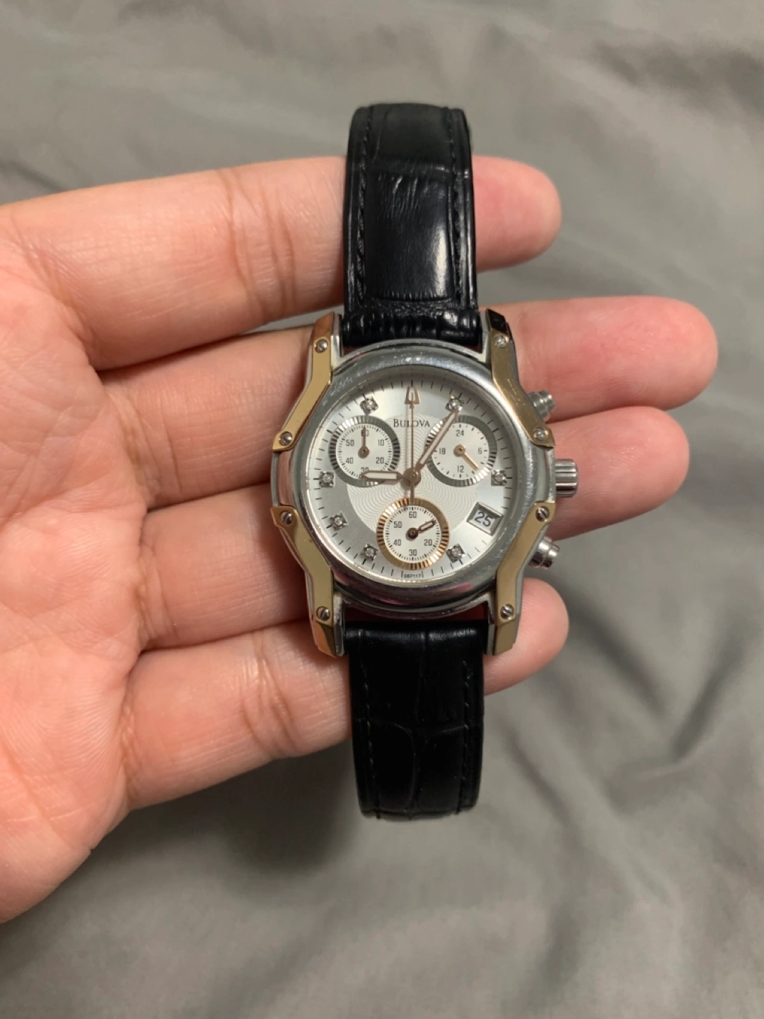 Selling a Bulova women’s chronograph watch with diamonds.The watch has a black leather strap and a silver and gold-tone face. It's in excellent condition and ready for a new home!Need new battery.