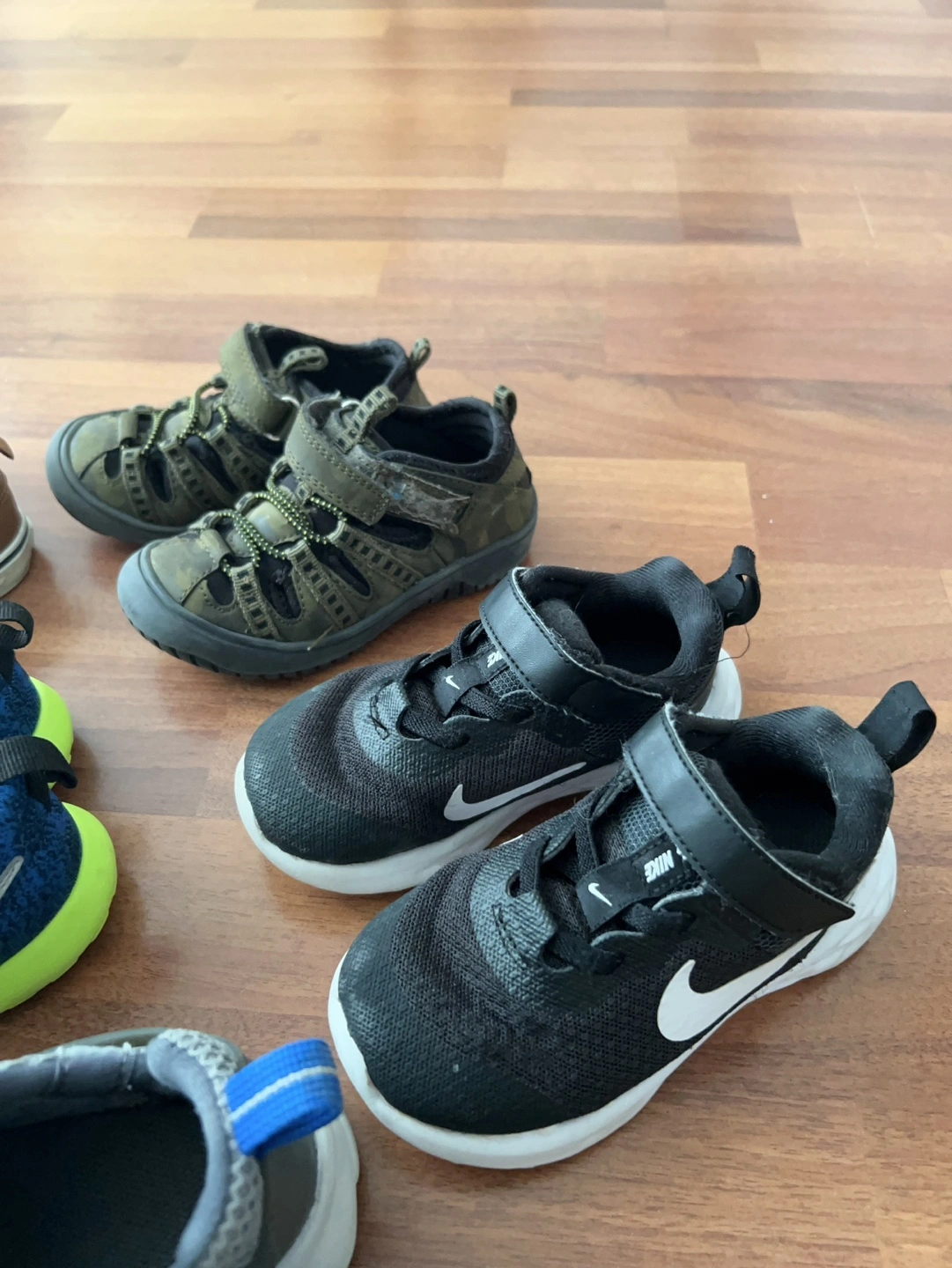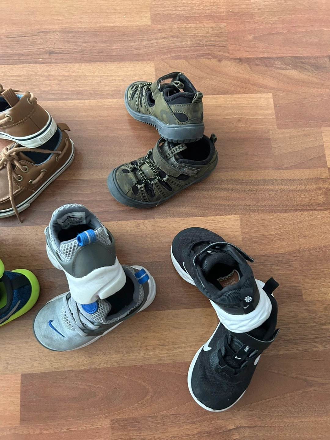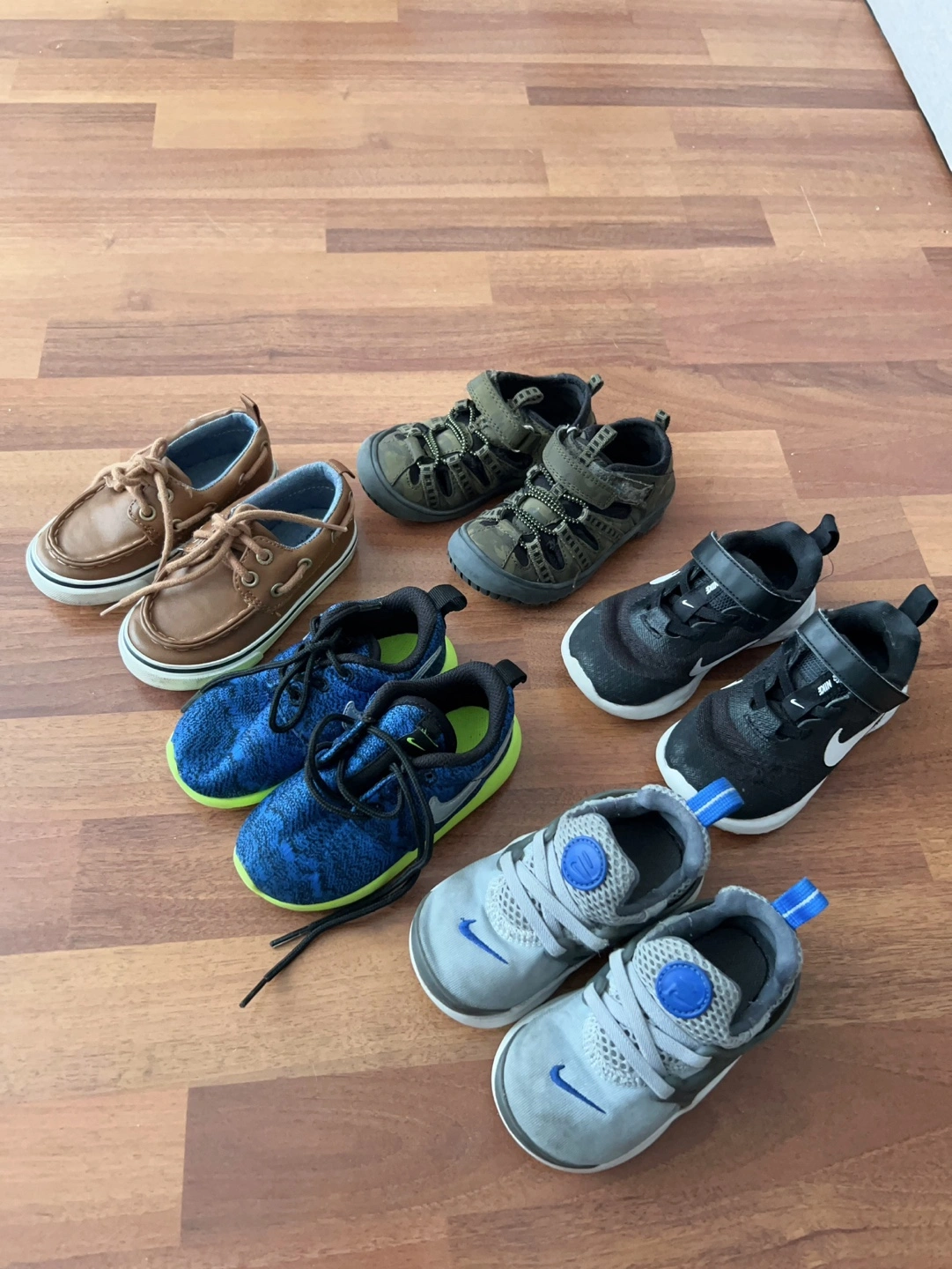 46Five pairs of toddler boy's shoes. Includes sneakers, boat shoes, and sandals. Sizes vary. Good used condition.
