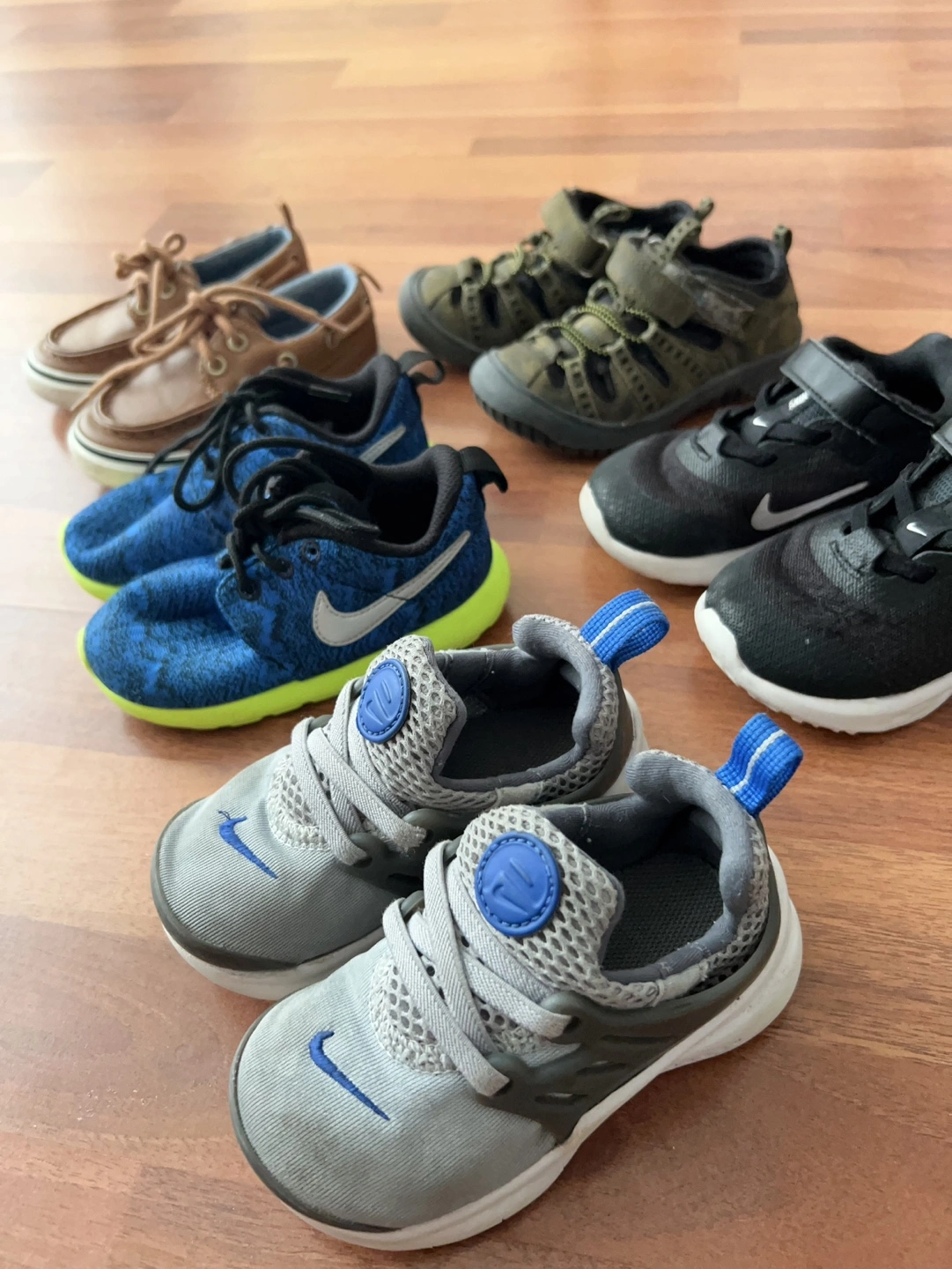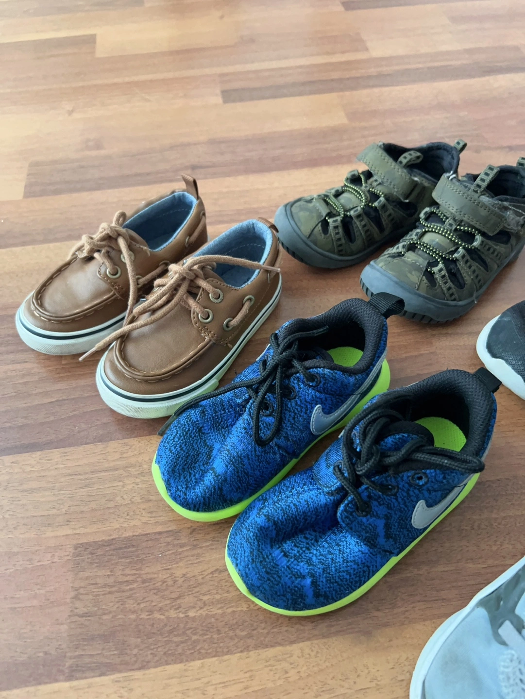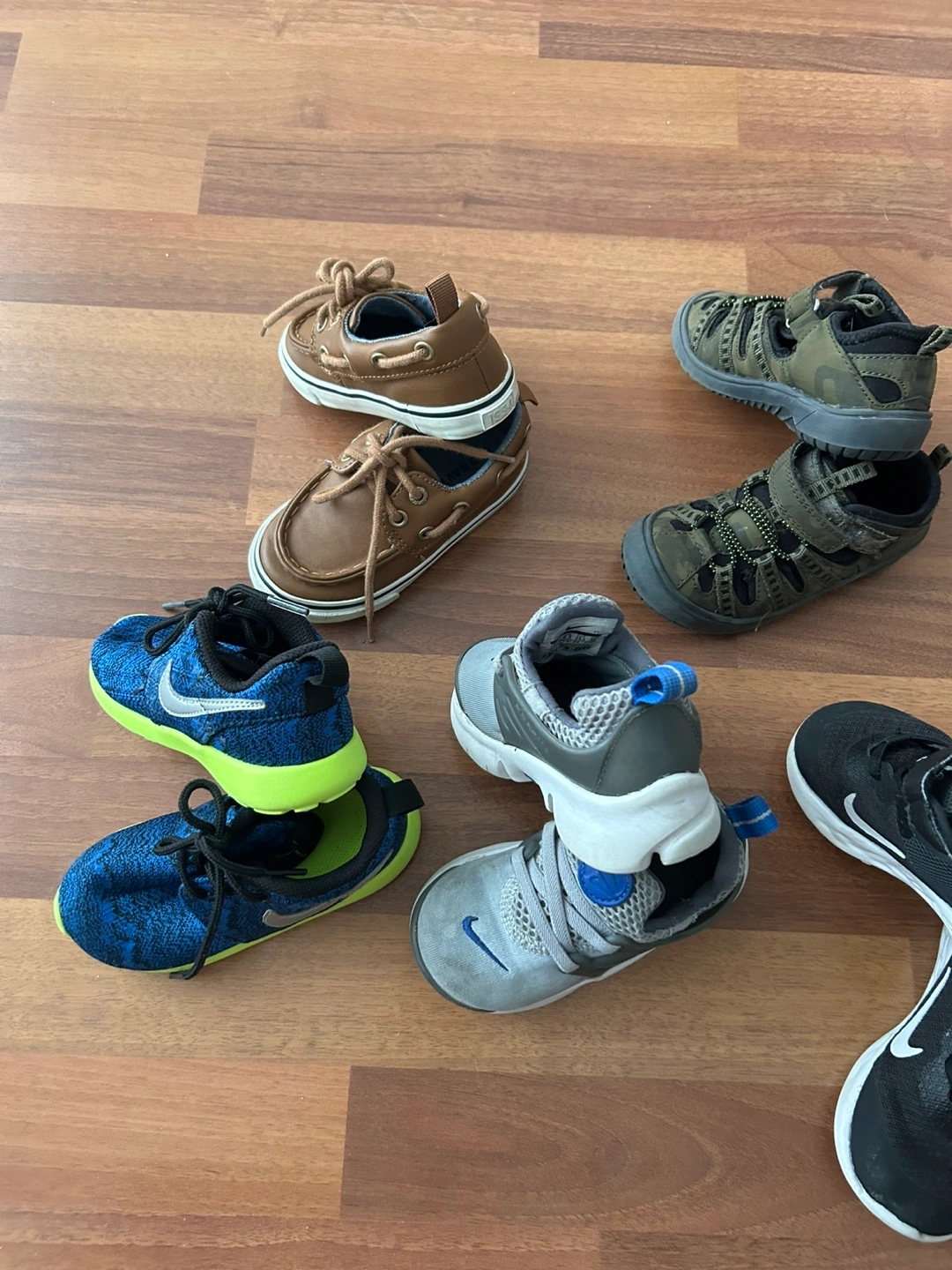46Five pairs of toddler boy's shoes. Includes sneakers, boat shoes, and sandals. Sizes vary. Good used condition.
