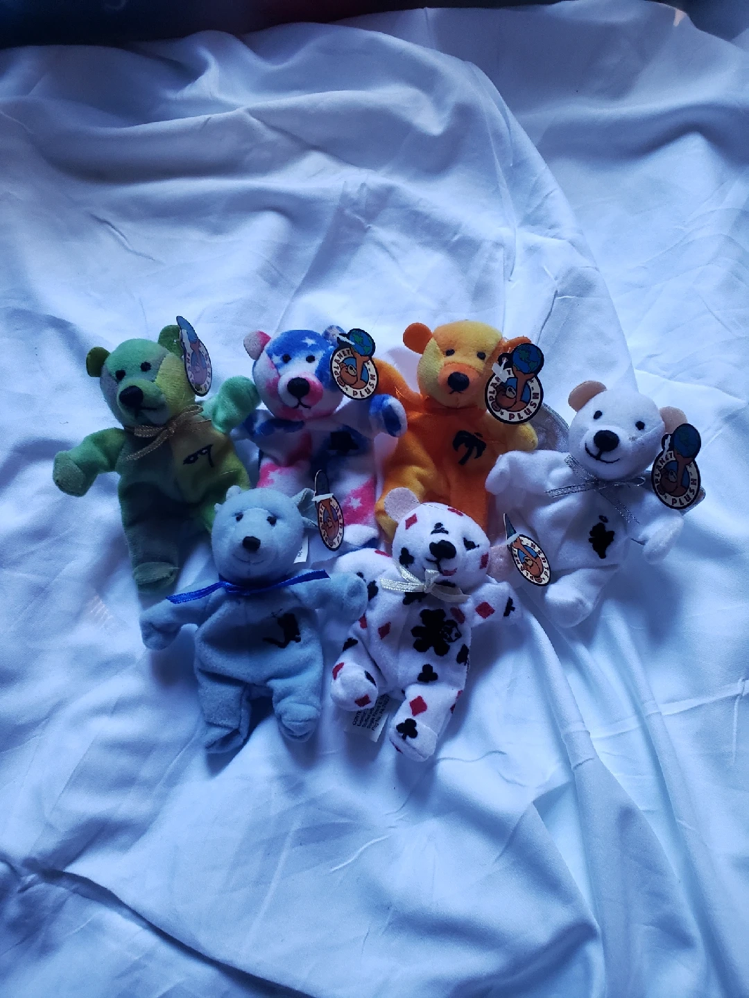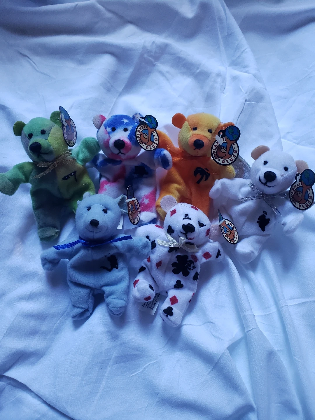 82Selling a set of six adorable Beanie Babies plush bears by PLANET PLUSH.com. Look them up online for prices. Tags have Name of Bear n which State they represent.CHANCE-Los Vegas, SUNNY-Florida, MARDI-New Orleans, Belle-Philidelphia, WINDY-Chicago. ANGEL-Los Angeles.These little guys are in great condition and ready for a new home. Each bear has its own unique design and charm. Perfect for collectors or anyone who loves cute plushies