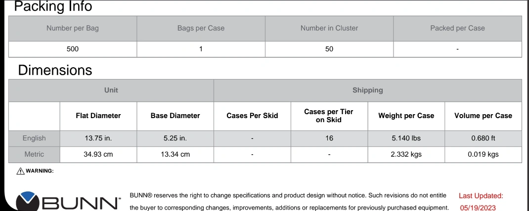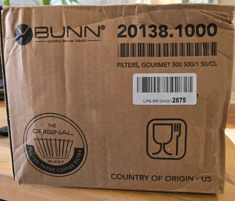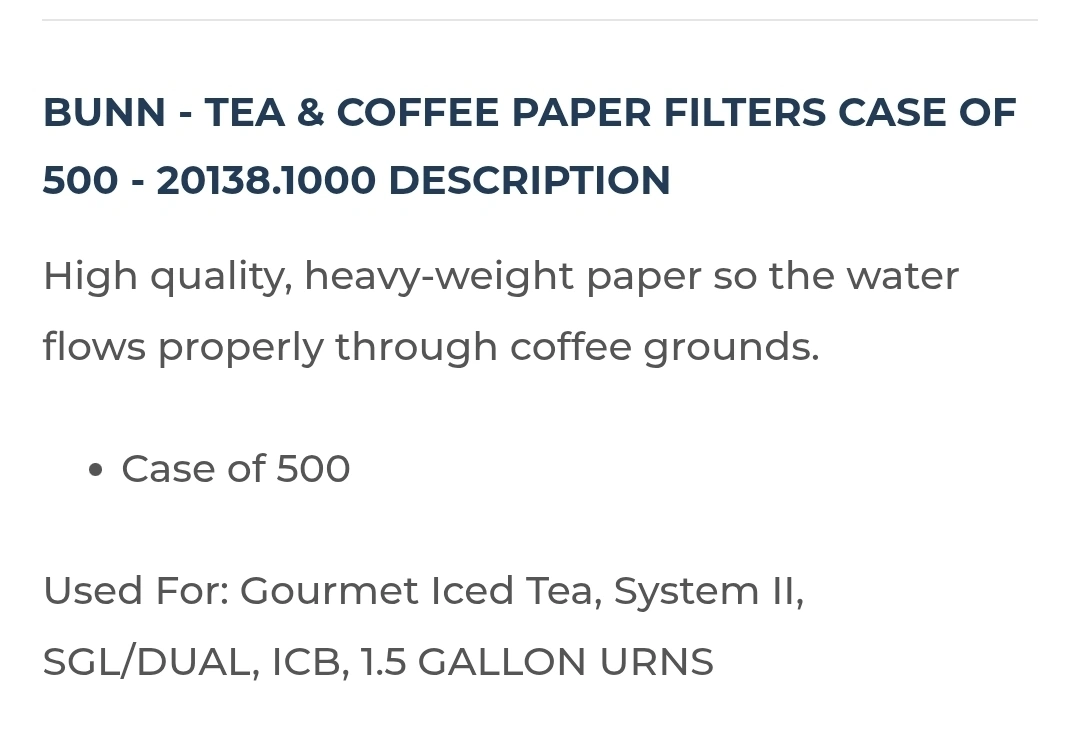 Selling a case of BUNN tea and coffee paper filters. This is a case of 500 filters, perfect for gourmet iced tea or coffee. The filters are made of high-quality, heavy-weight paper. These filters are designed for use with System II, SGL/DUAL, ICB, and 1.5-gallon urns. The original price was $44.99. The box is included!