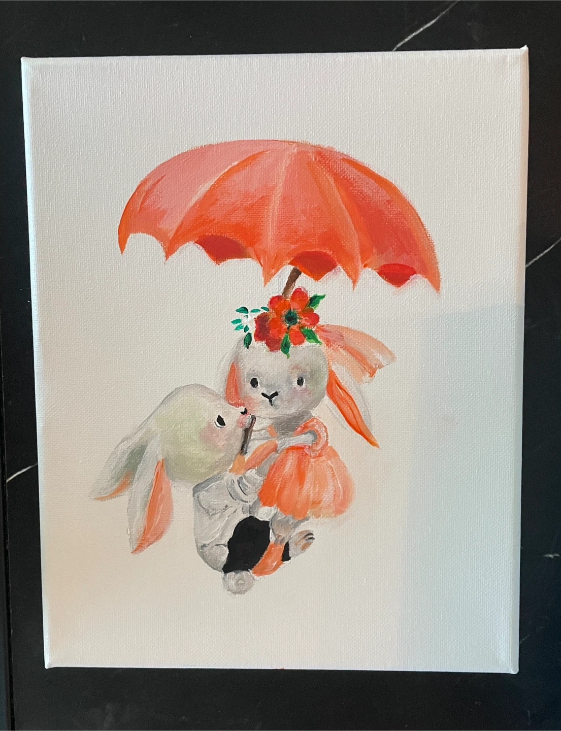 85A cute painting of bunnies with an umbrella on canvas, perfect for a nursery or child's room. It's Oil color and handmade Size:10" *8"