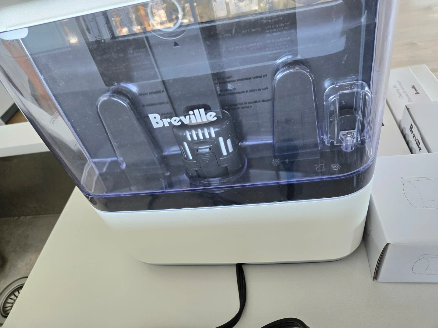 Breville white espresso machine complete with a Baratza grinder and various additional accessories. Includes 54mm filter baskets, water filters, and a cleaning kit.