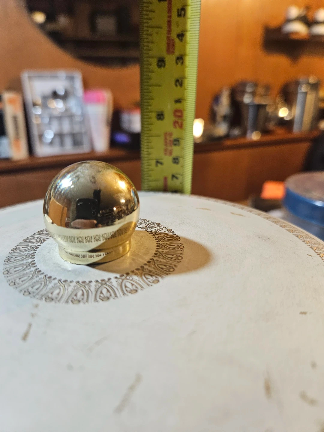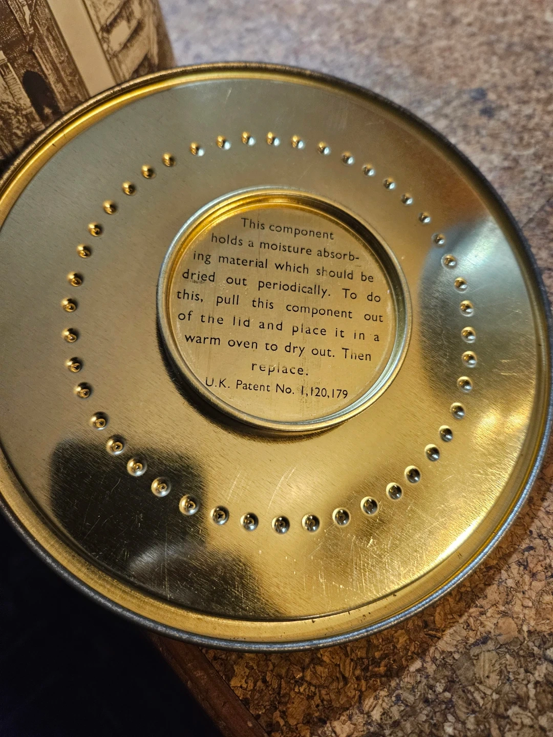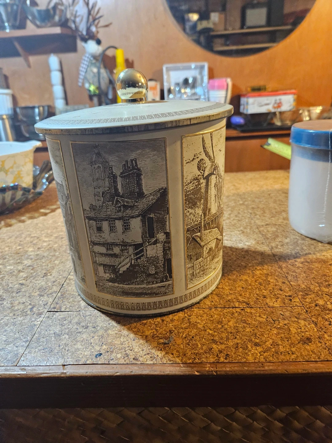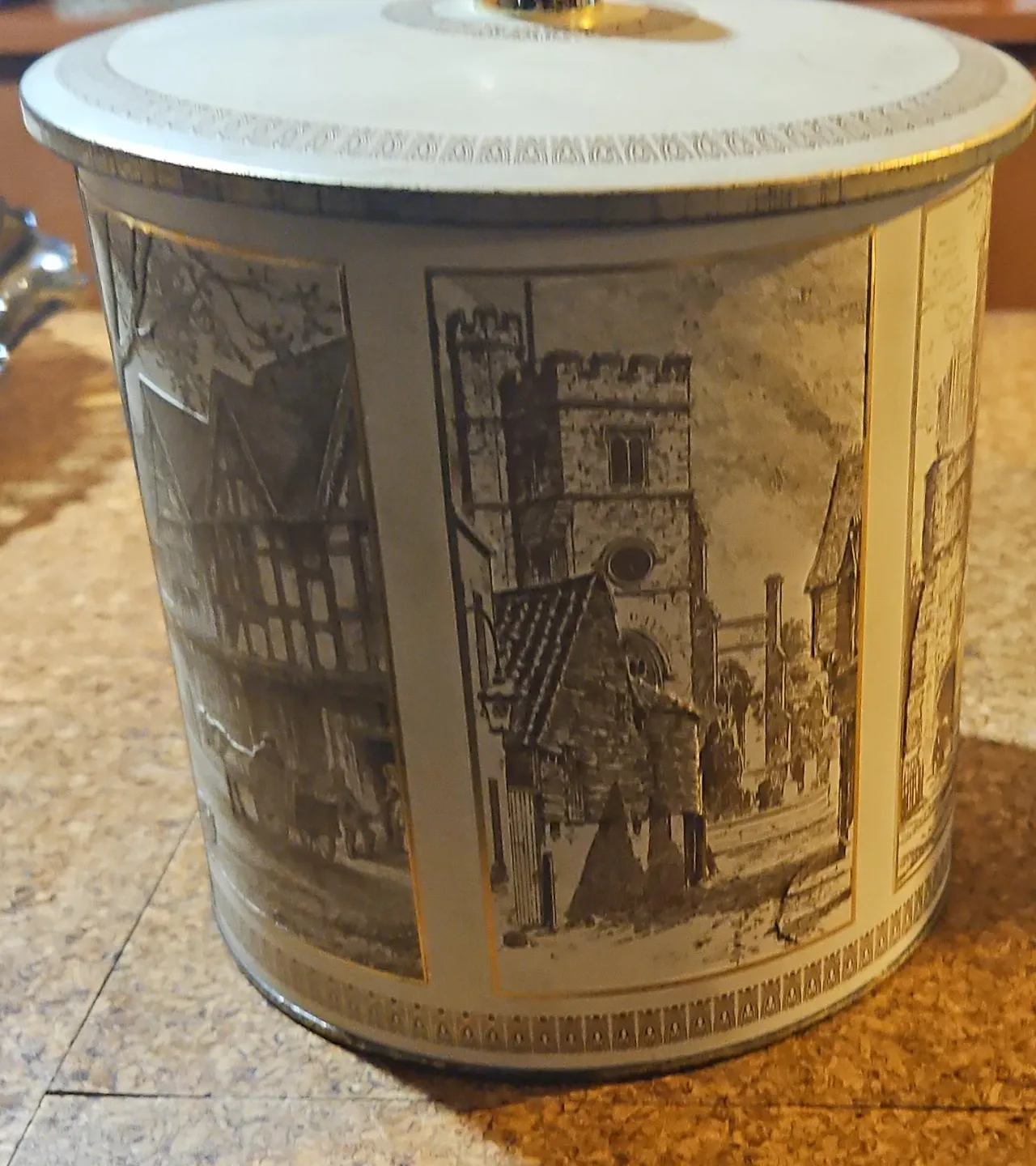 This is a vintage decorative metal tin featuring scenic engravings and a gold lid with a moisture absorbing component. The tin has a diameter of approximately 6 inches and a height of about 7 inches. The lid's moisture absorber can be dried out and replaced. It's a charming piece for storage or display!