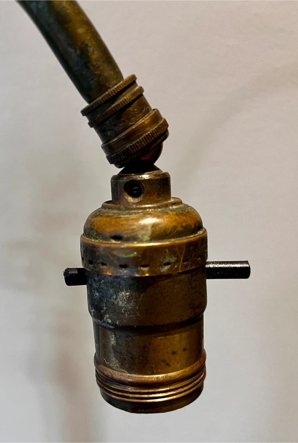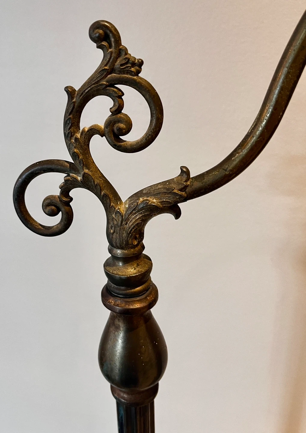 Bridge Arm: The distinctive curved "bridge" arm was designed to position the light source over a shoulder for reading, making these frequent additions to parlors and libraries.
