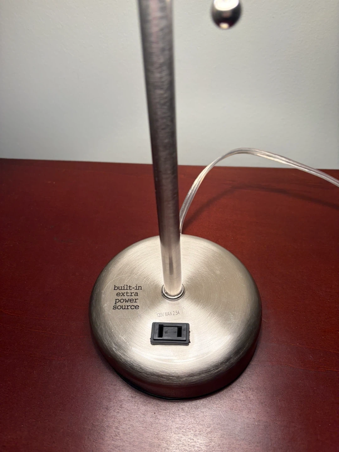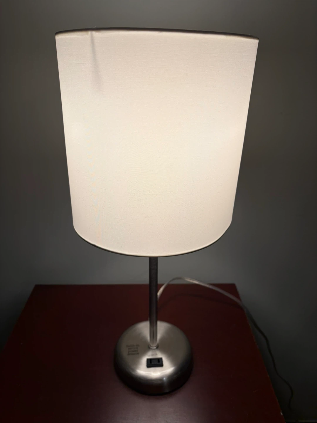 This table lamp features a brushed nickel finish and a white fabric shade. It has a built-in extra power source on the base for convenient charging. The base is circular and weighted for stability. It's suitable for a bedside table or desk.