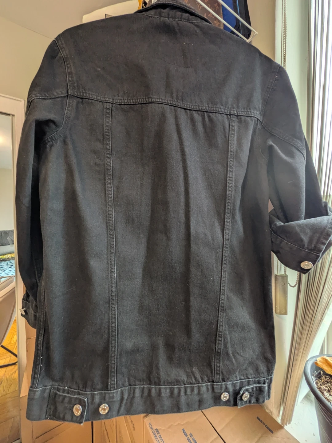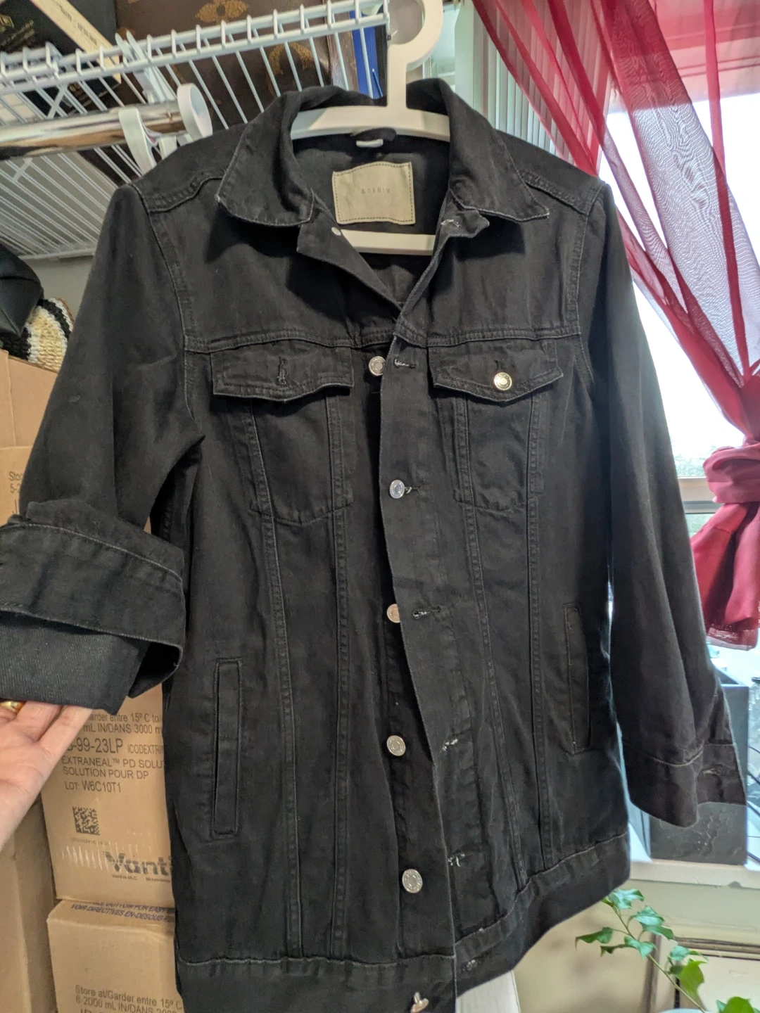 Classic black denim jacket by & DENIM. Button-up front with two chest pockets. This jacket's made from sturdy denim material. Great for layering over any outfit!