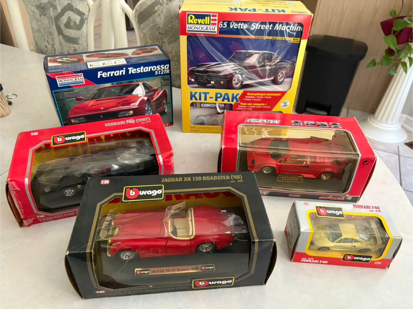 73Selling a collection of diecast cars including Burago Ferrari F40, Jaguar XK 120 Roadster, and Majorette Lamborghini Countach. All are in their original boxes!