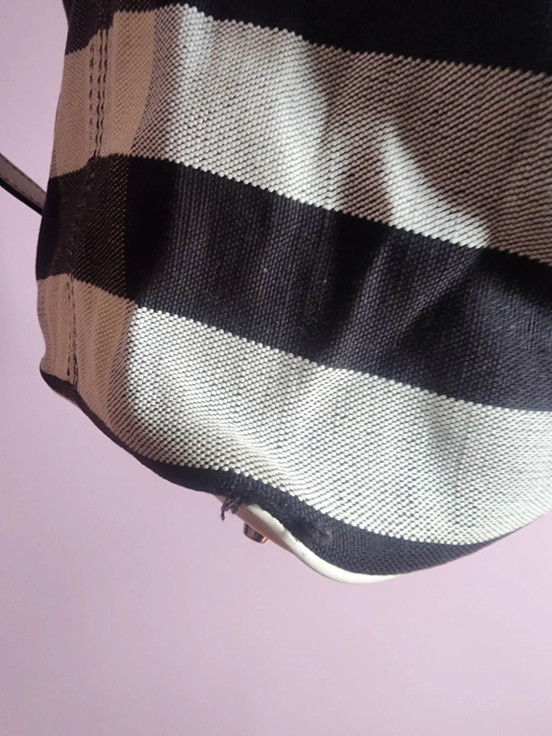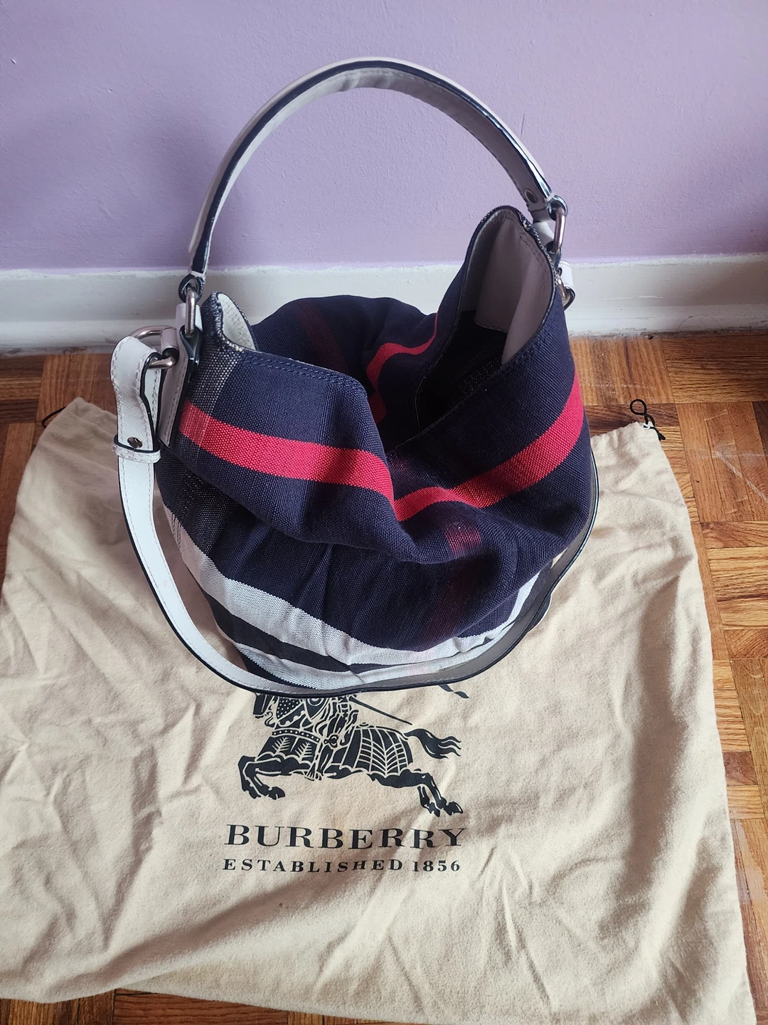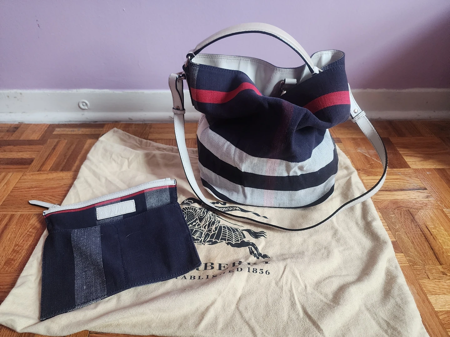 Burberry Bucket Bag,Blue Canvas,Striped,Silver-Tone, Flat Handle & Single Adjustable Shoulder Strap Leather Trim Embellishment,Canvas Lining & Three, Interior Pockets,Clasp Closure at Top Shoulder Strap Drop: 19.5" Handle Drop: 4.75" Height: 12.75" Width: 12" Depth: 18" Details: Leather strap is a little discolored but not noticeable, slightly ripped on coner seen in pic.