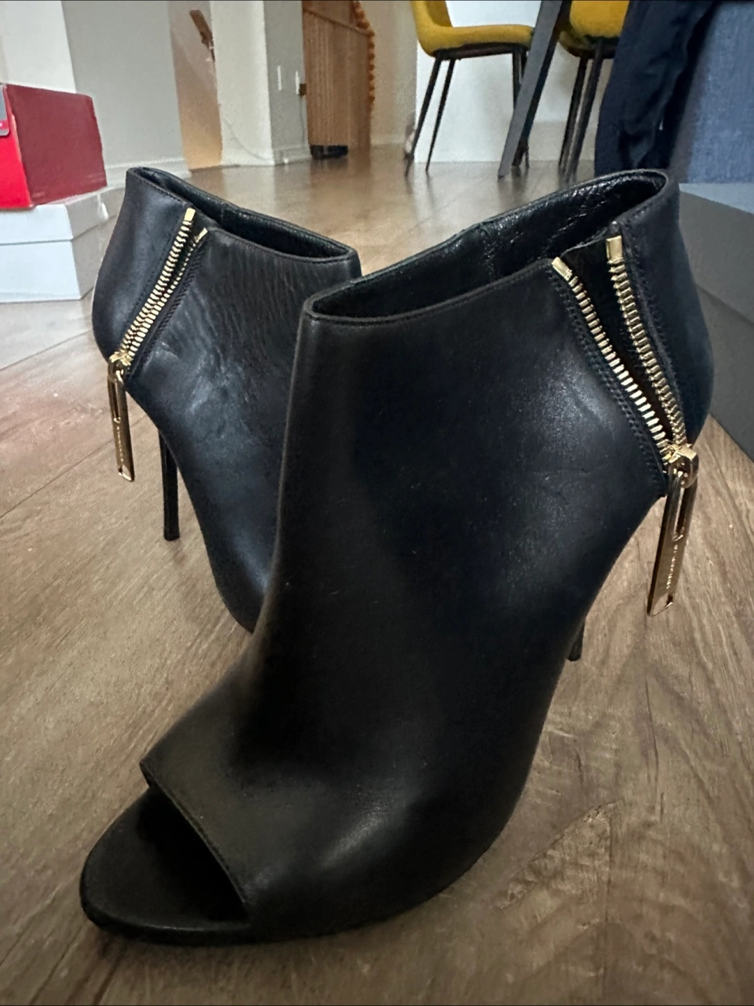 Selling a pair of Burberry black leather open-toe booties. These stylish heels feature a unique zipper detail and are perfect for adding a touch of elegance to any outfit. They show slight signs of wear.