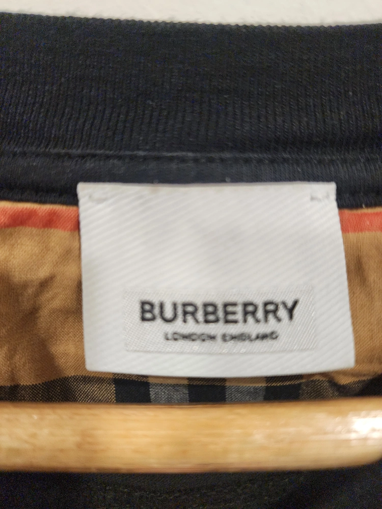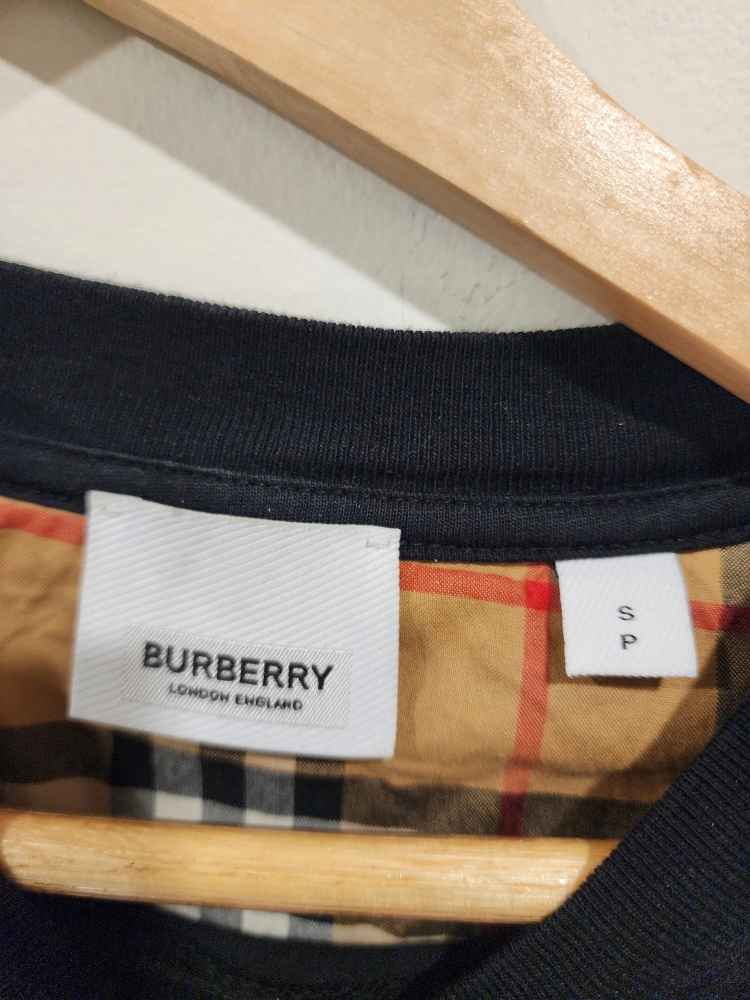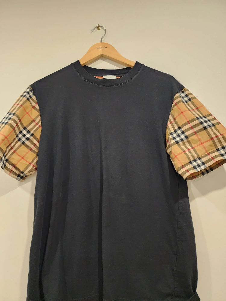 Selling a stylish Burberry T-shirt! It's black with the classic Burberry plaid pattern on the sleeves. The size is S. It's in great condition and ready for a new home!