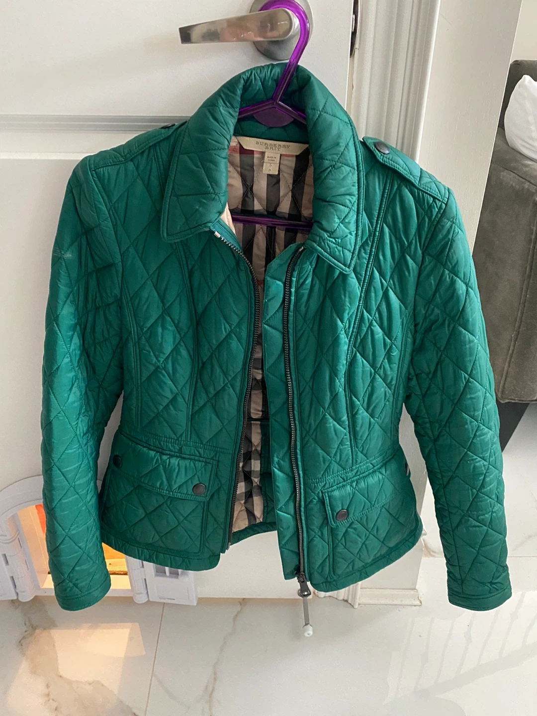 Selling a Burberry Brit quilted jacket in a lovely green colour! It's a size small and features the classic Burberry check lining. Perfect for adding a touch of style to your wardrobe!