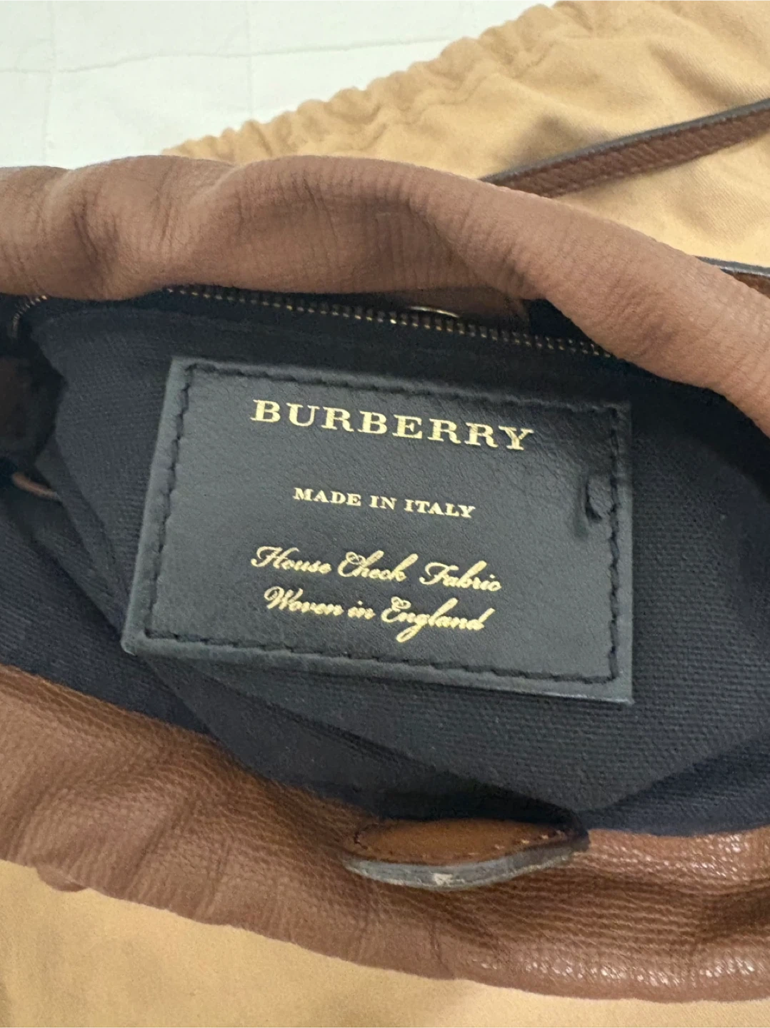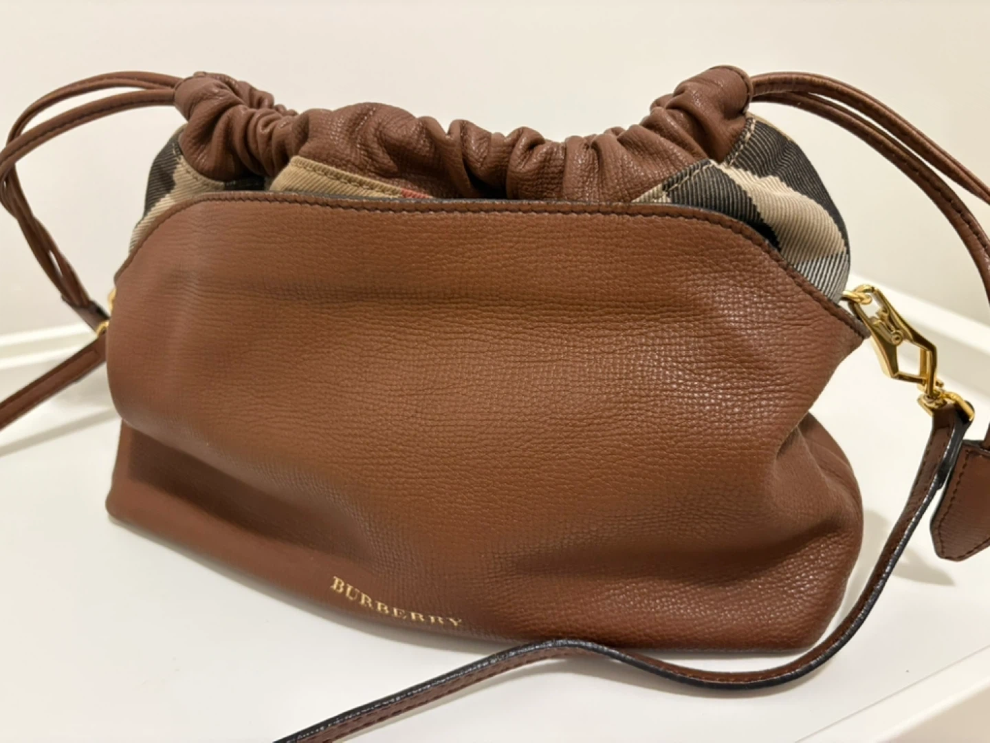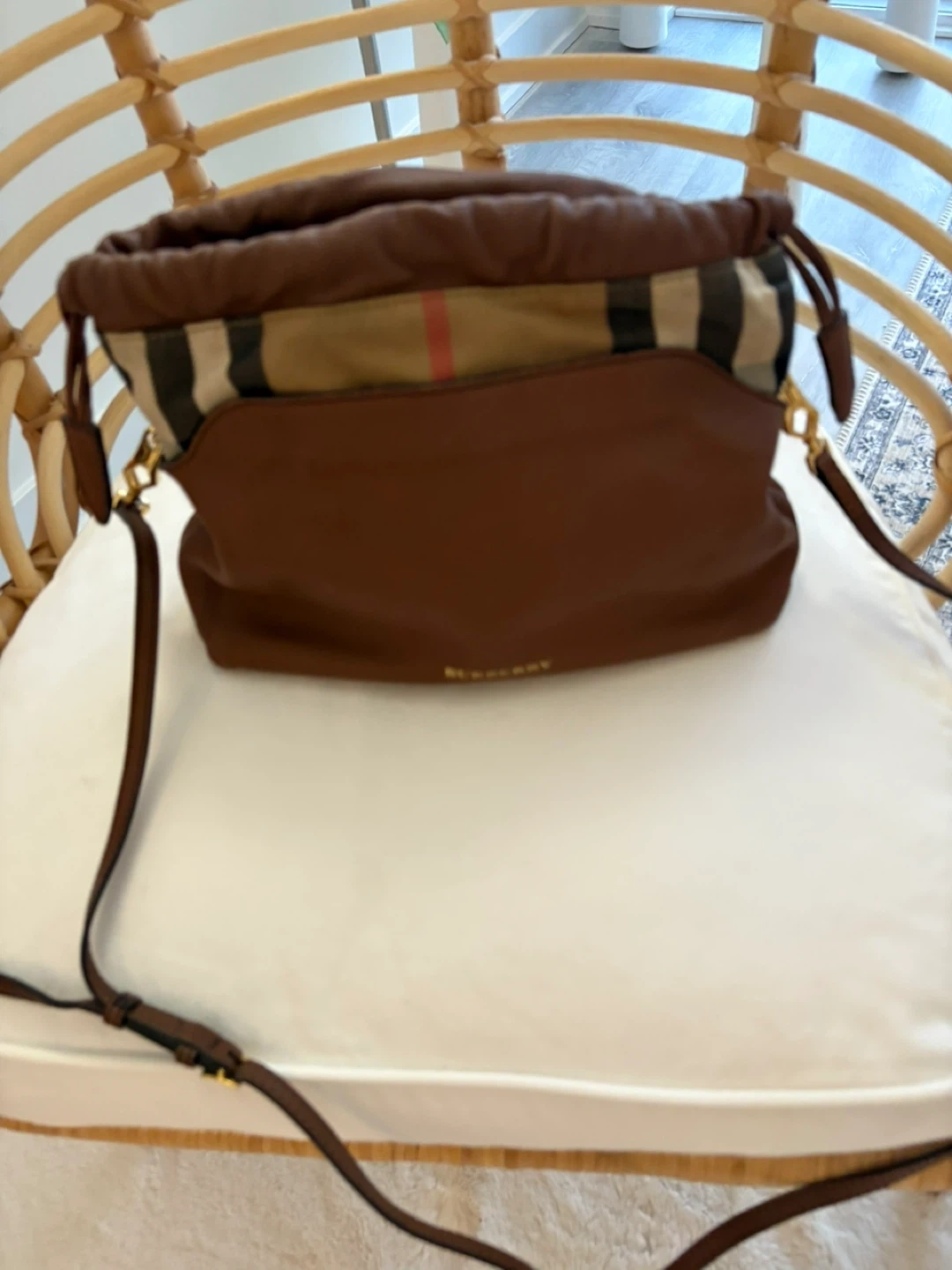 Selling a Burberry brown leather drawstring bucket bag! It's in great condition and features the classic Burberry check pattern on the drawstring portion. Perfect for everyday use!