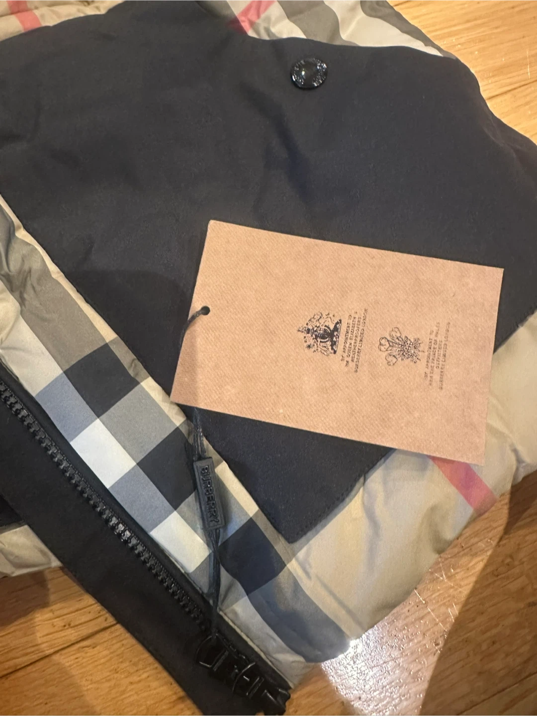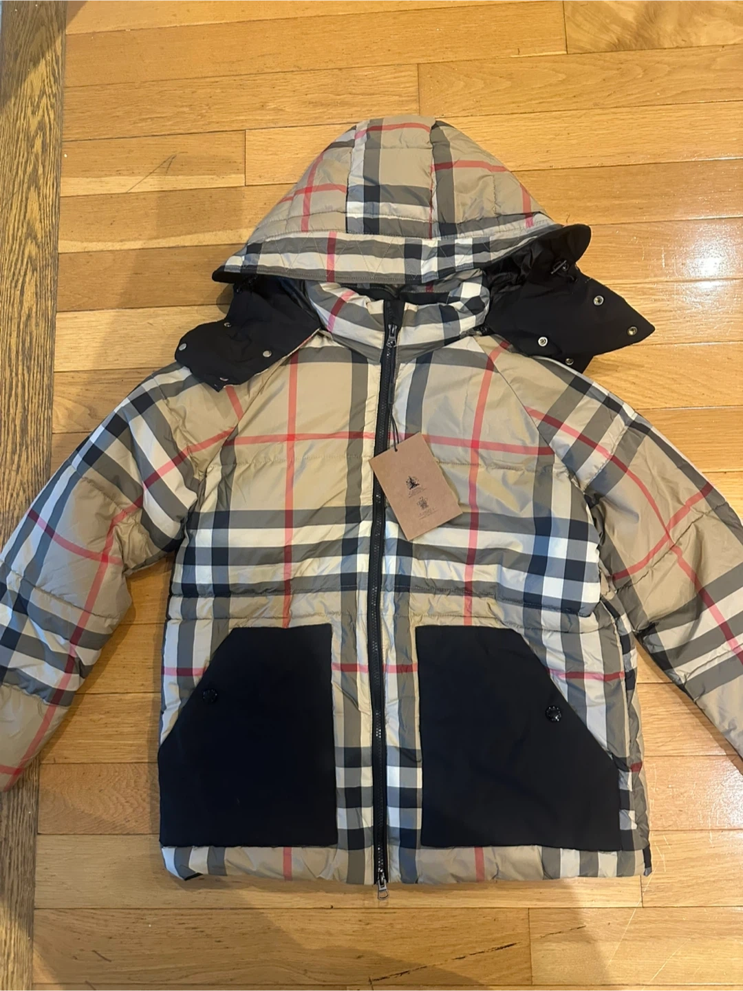 10Selling a Burberry puffer jacket with the classic check pattern. It's brand new with tag and features a hood and black detailing. Perfect for staying warm and stylish!