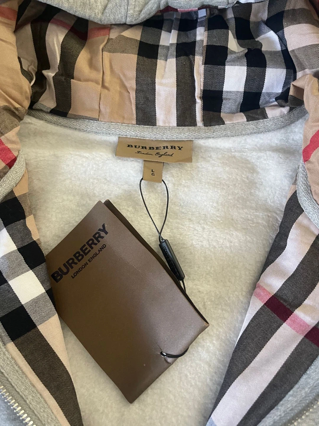 10Selling a Burberry grey hoodie in size large. It features the classic Burberry check pattern on the inside of the hood. The hoodie is in great condition and comes with the original tag.