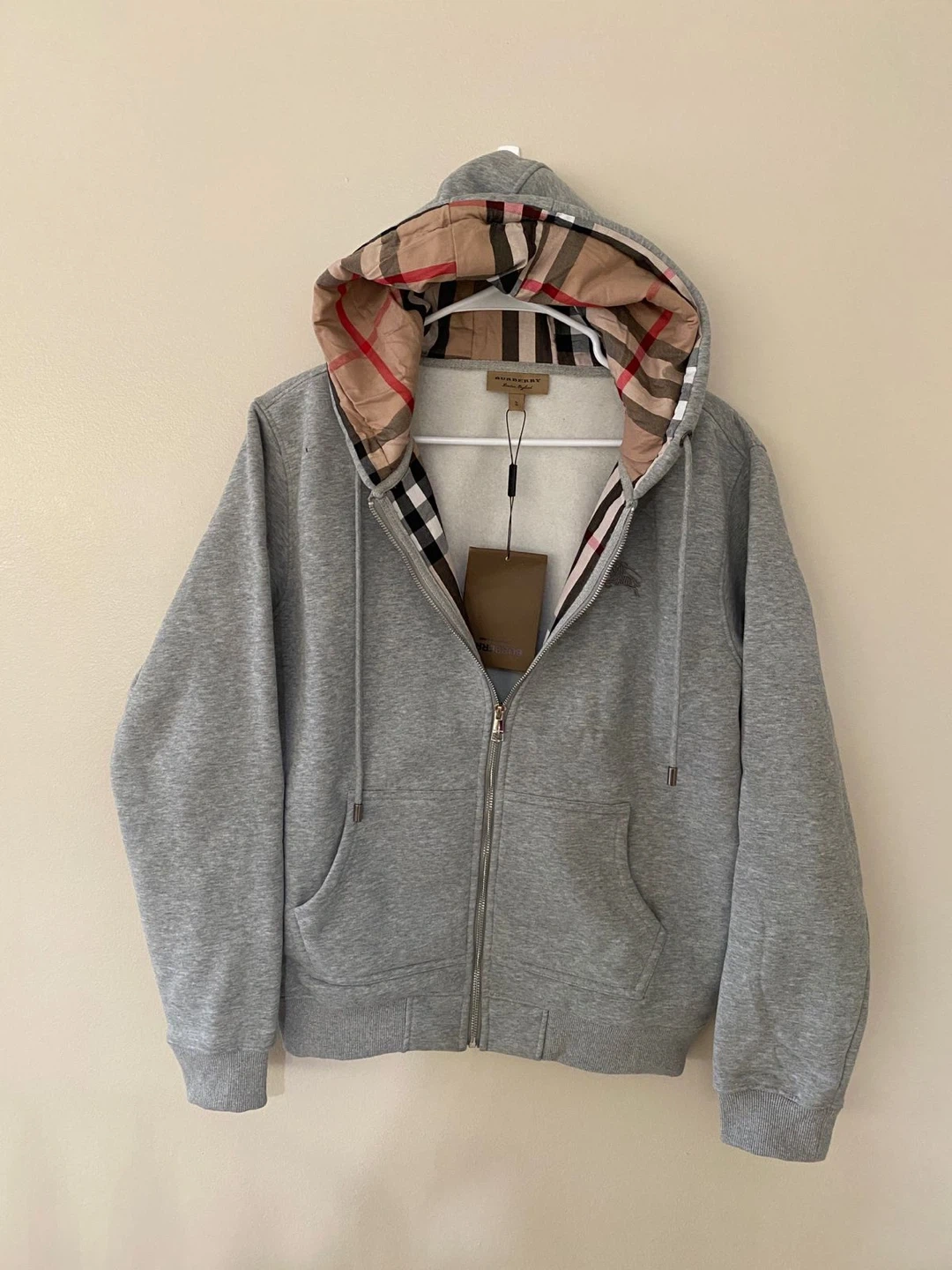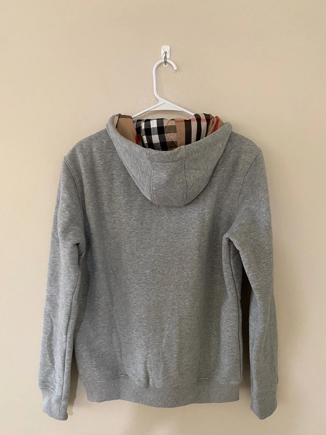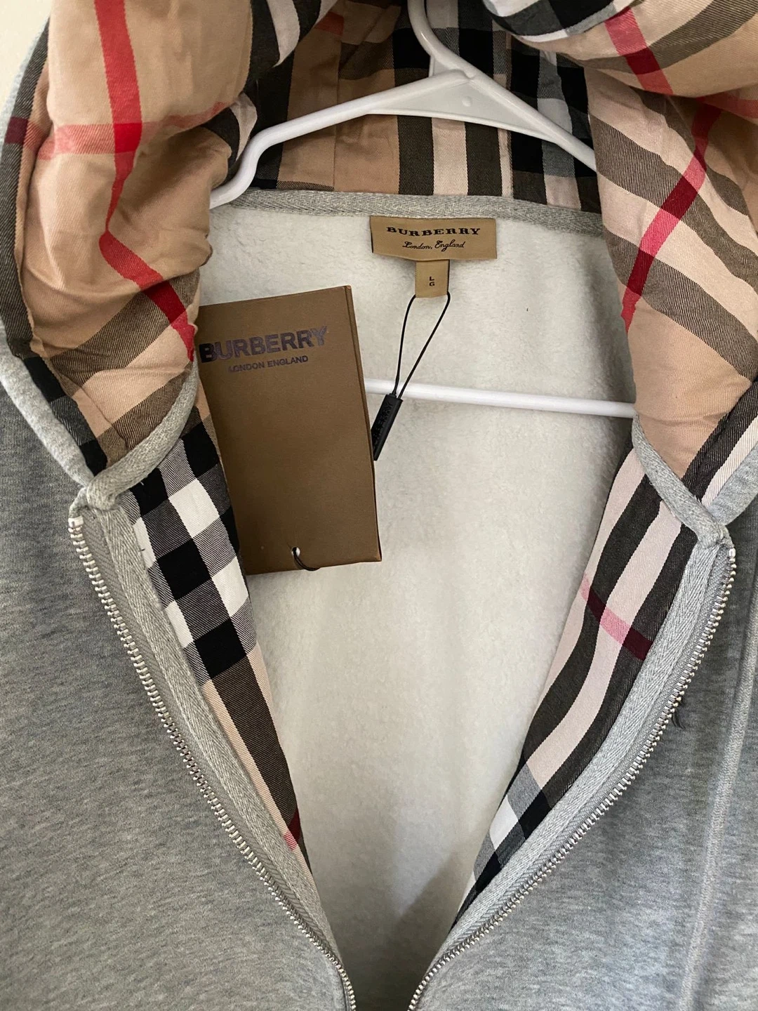 10This is a grey Burberry London England hoodie in a size large! It features the classic Burberry plaid on the hood lining and trim. Perfect for adding a touch of luxury to your casual wear