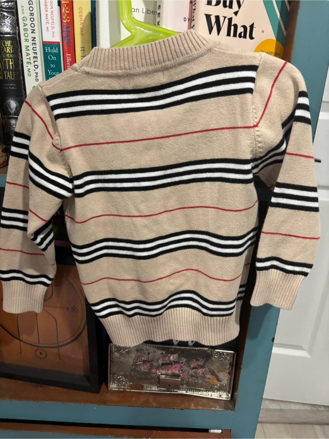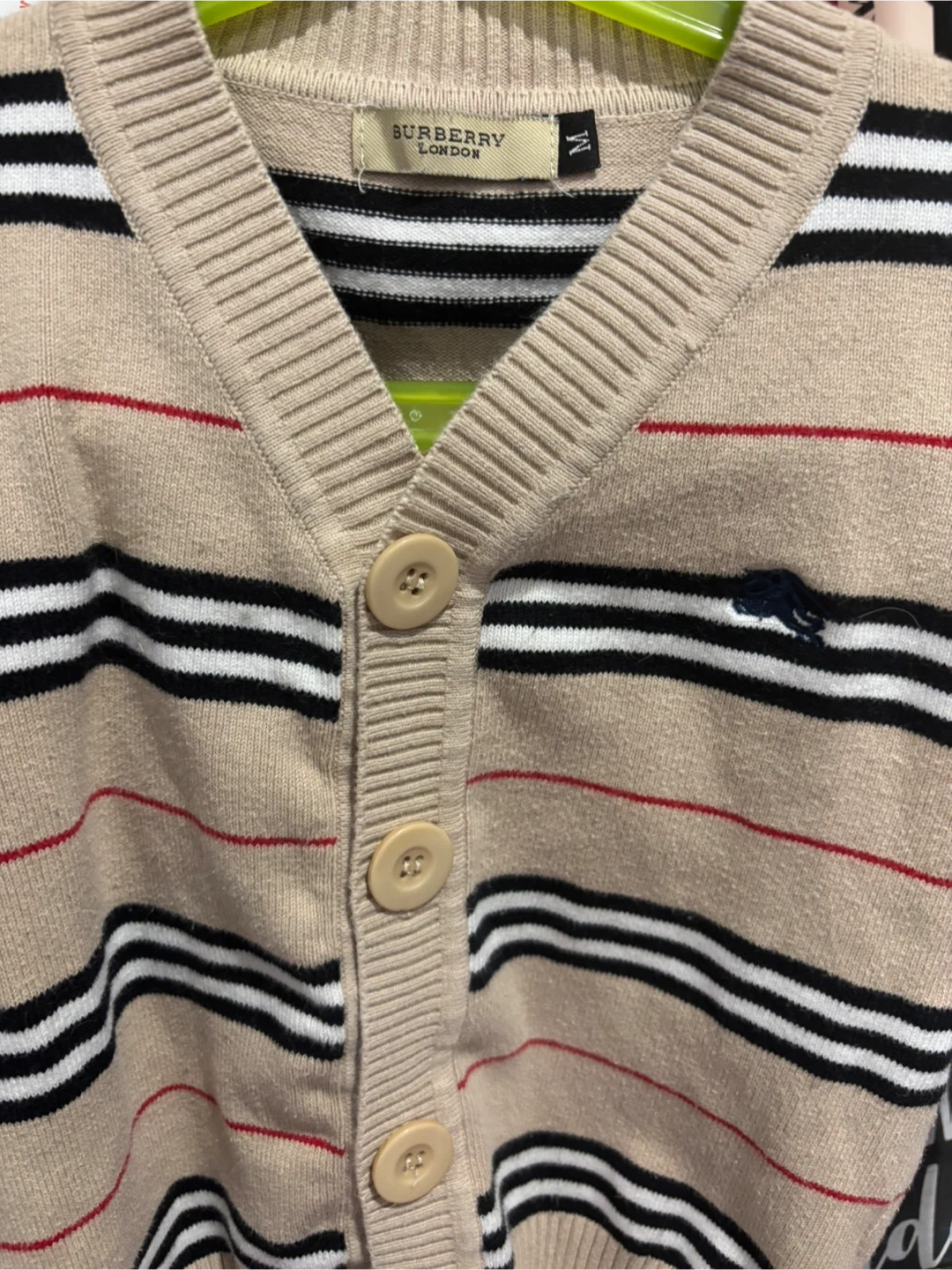 59Here's a cute Burberry London cardigan for kids! It's in great condition and features a classic striped design in beige, black, and red. The size is M.
