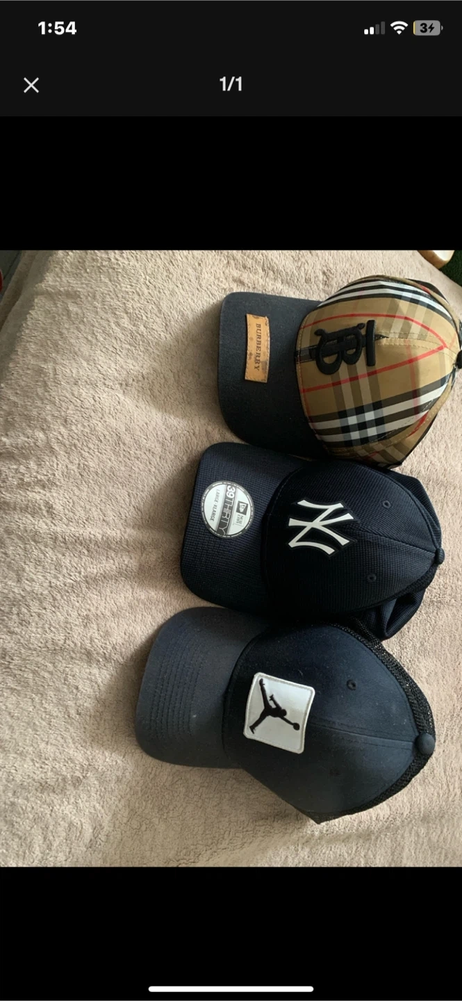 17Selling three hats: a Burberry plaid hat 50$, a New Era NY Yankees hat 15$ (size 39THIRTY Large-XLarge), and a black Jordan hat 15$