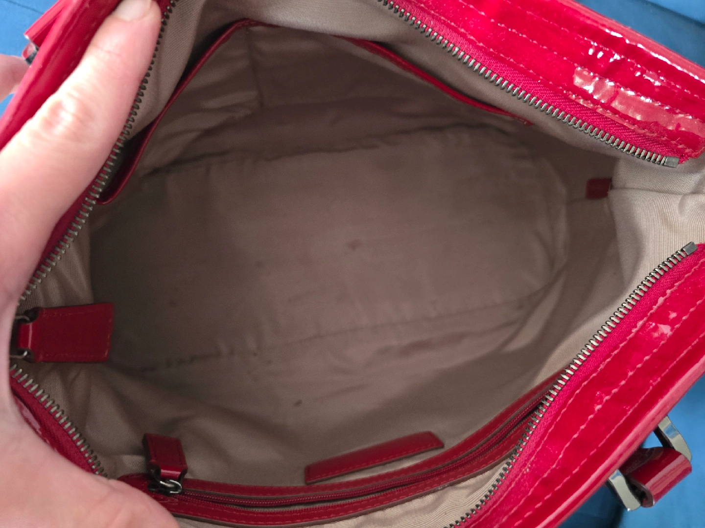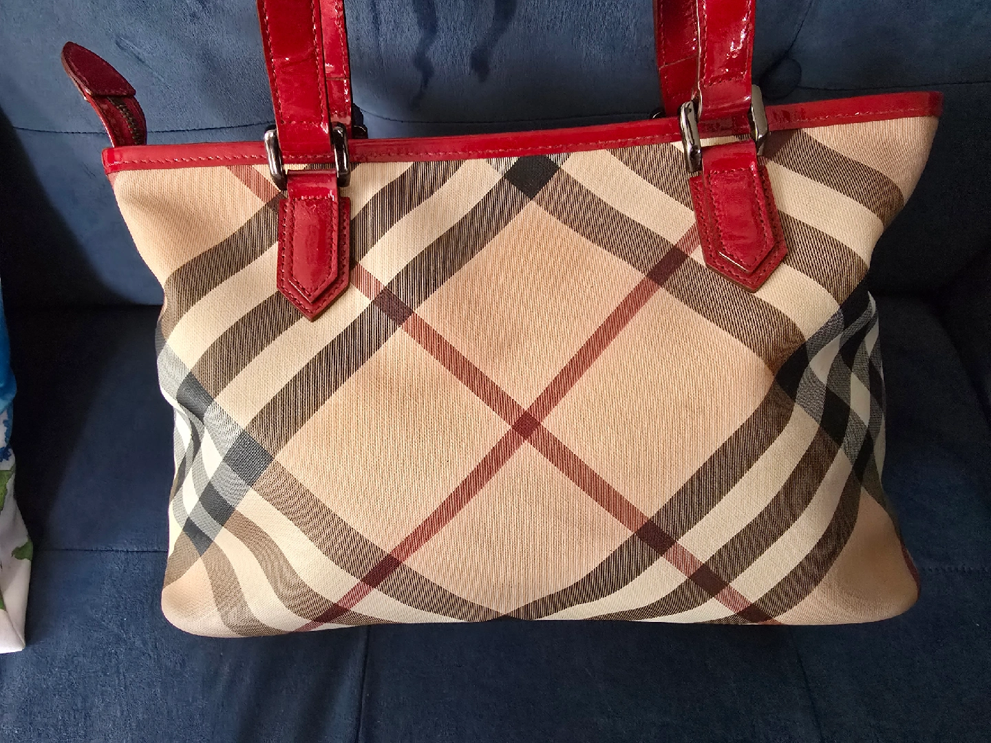 60Here's a Burberry tote bag in a classic plaid pattern with red patent leather trim and handles! It has a zip closure and interior pockets to keep your belongings organized. It's a stylish and timeless piece!