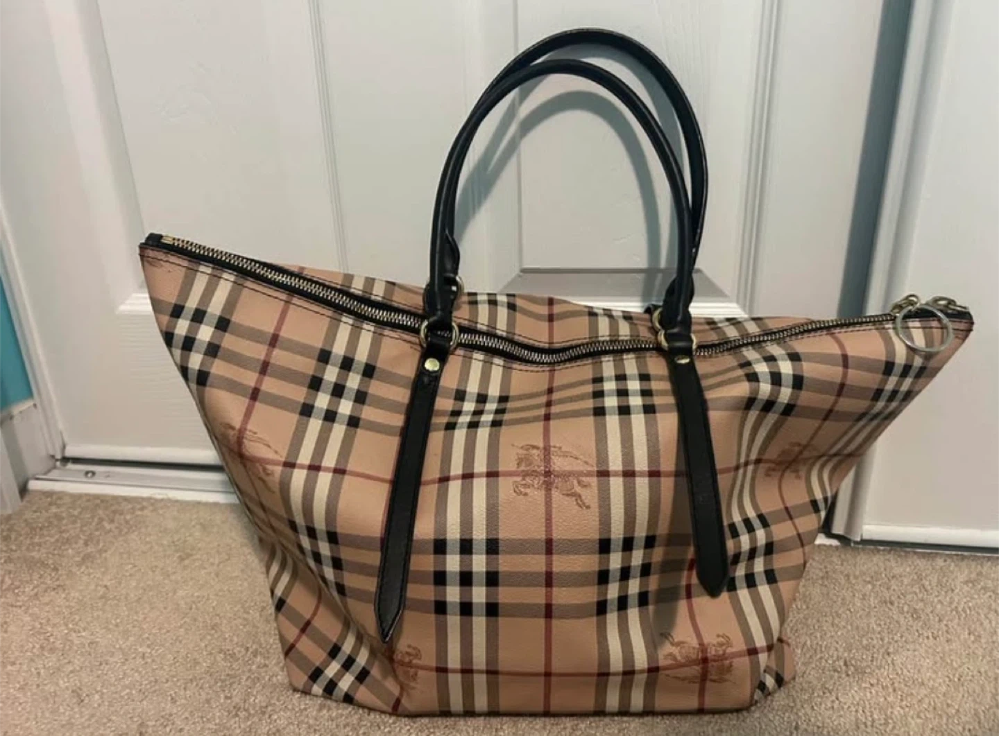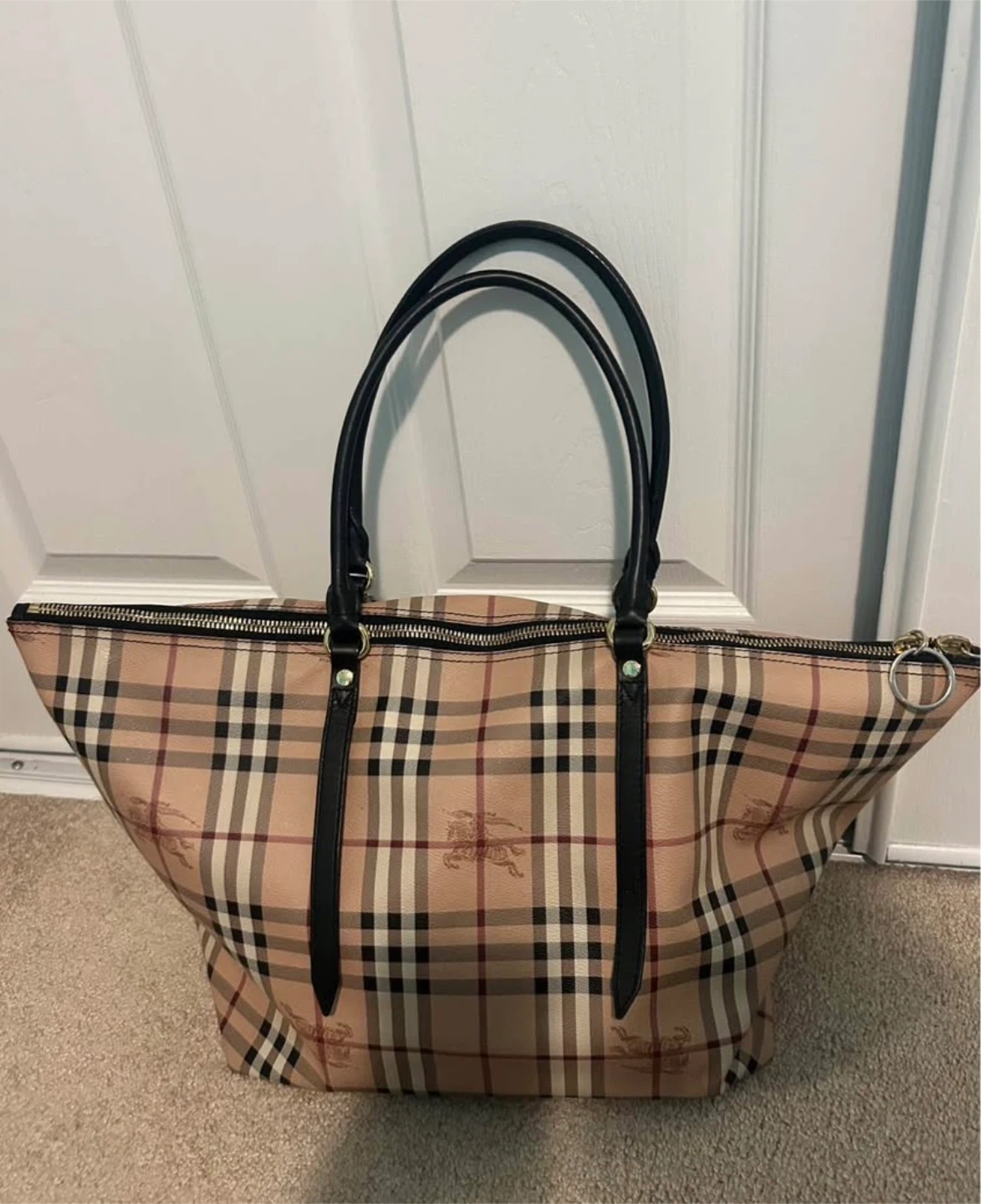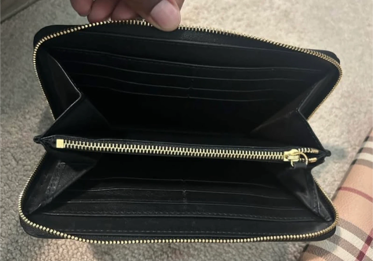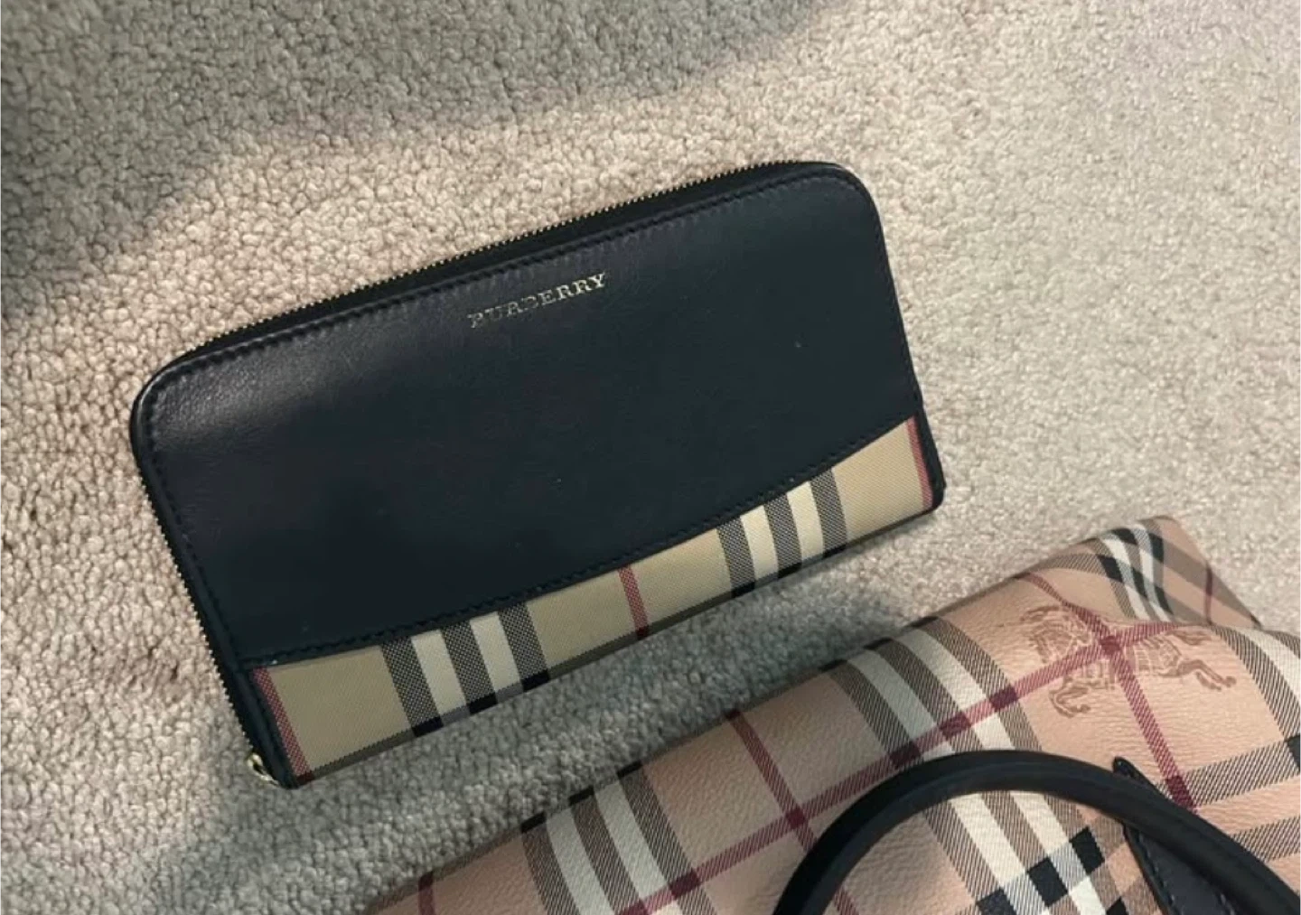 Selling a Burberry wallet and tote bag set. The wallet is a zip-around style with a black exterior and classic Burberry check accent. The tote bag features the iconic Burberry check pattern with black leather straps. Both items are in great condition! Just missing the piece to pull the zipper closed. I’m willing to negotiation pricing and sell separately., if want!