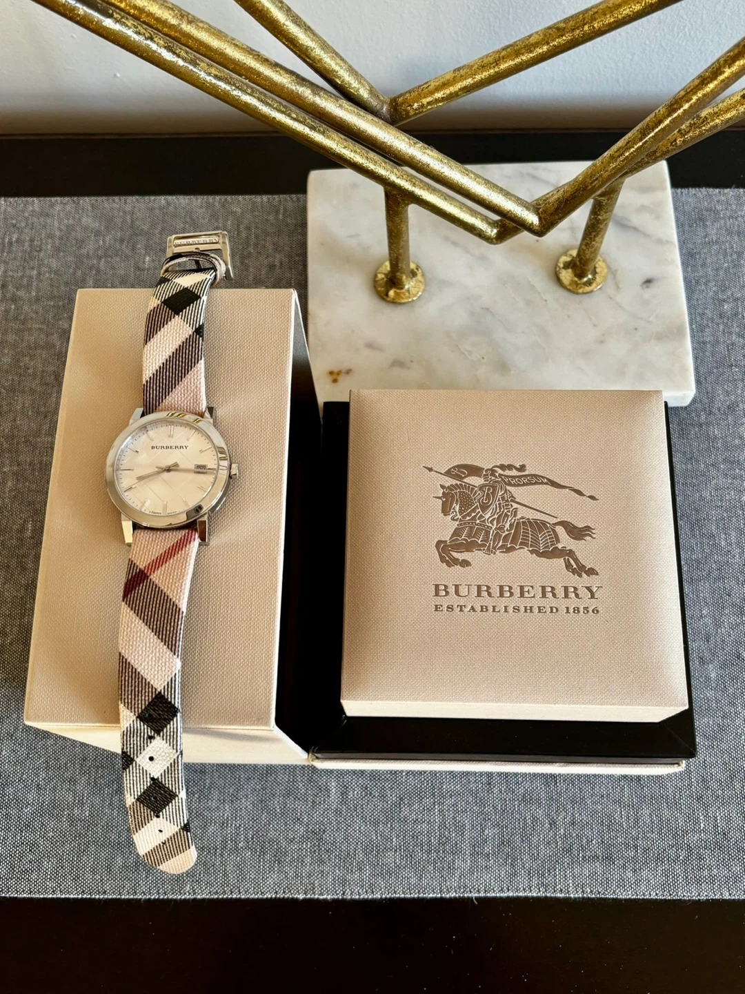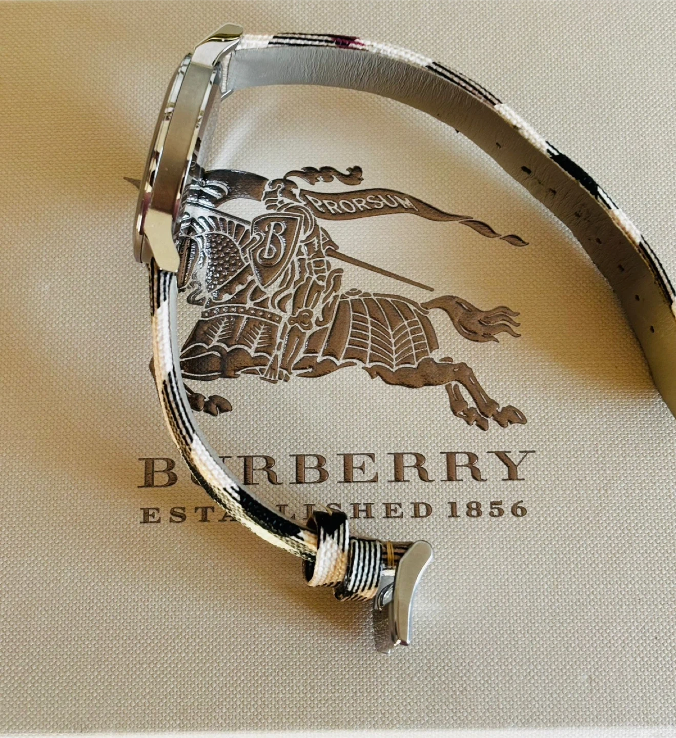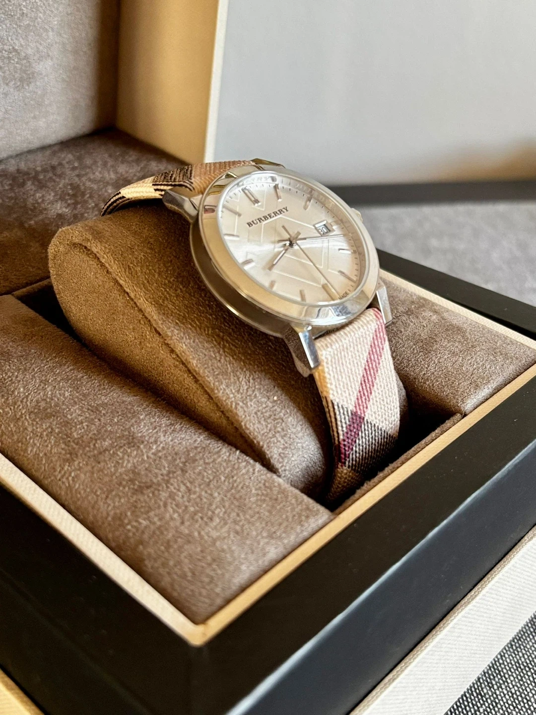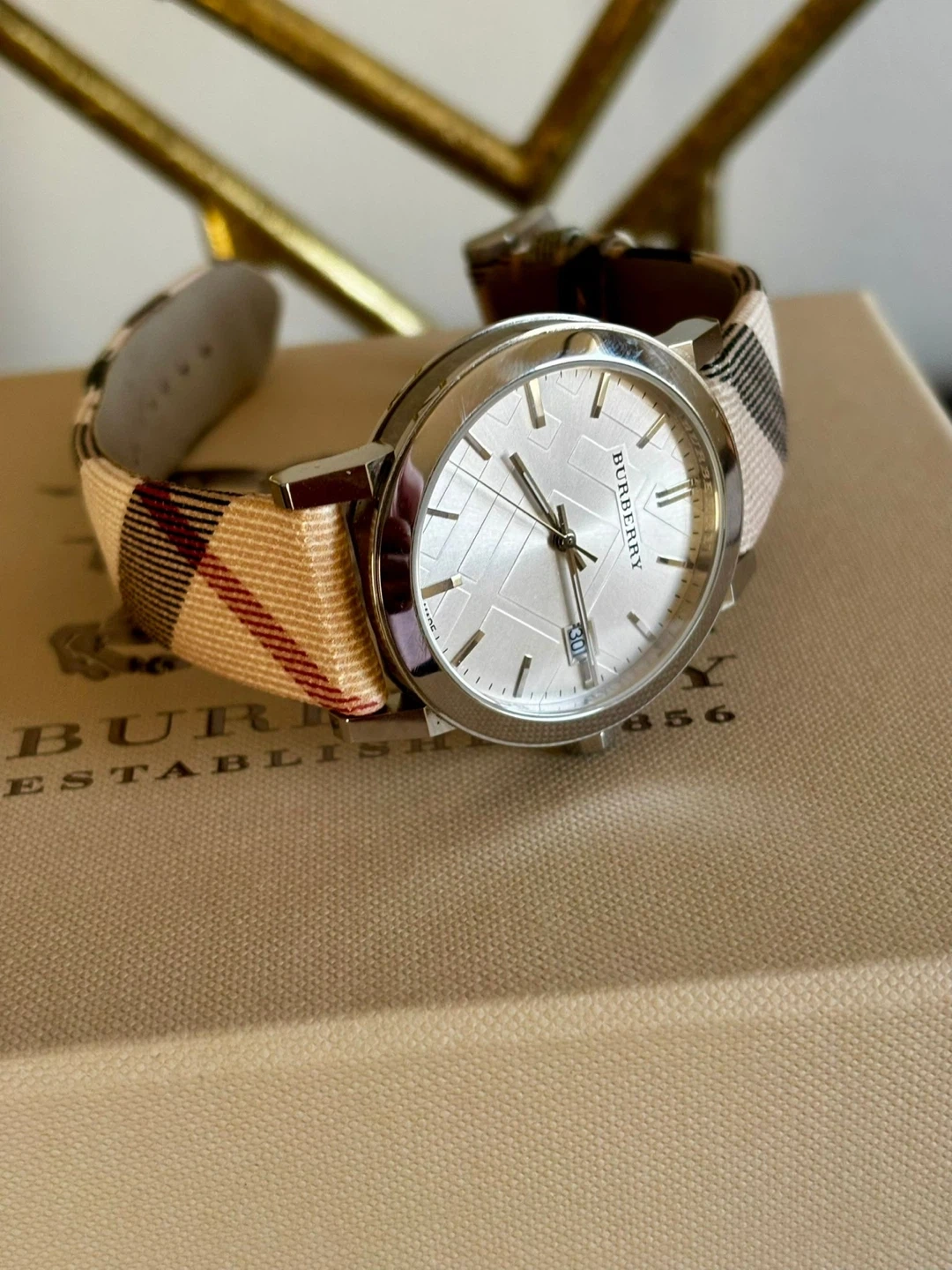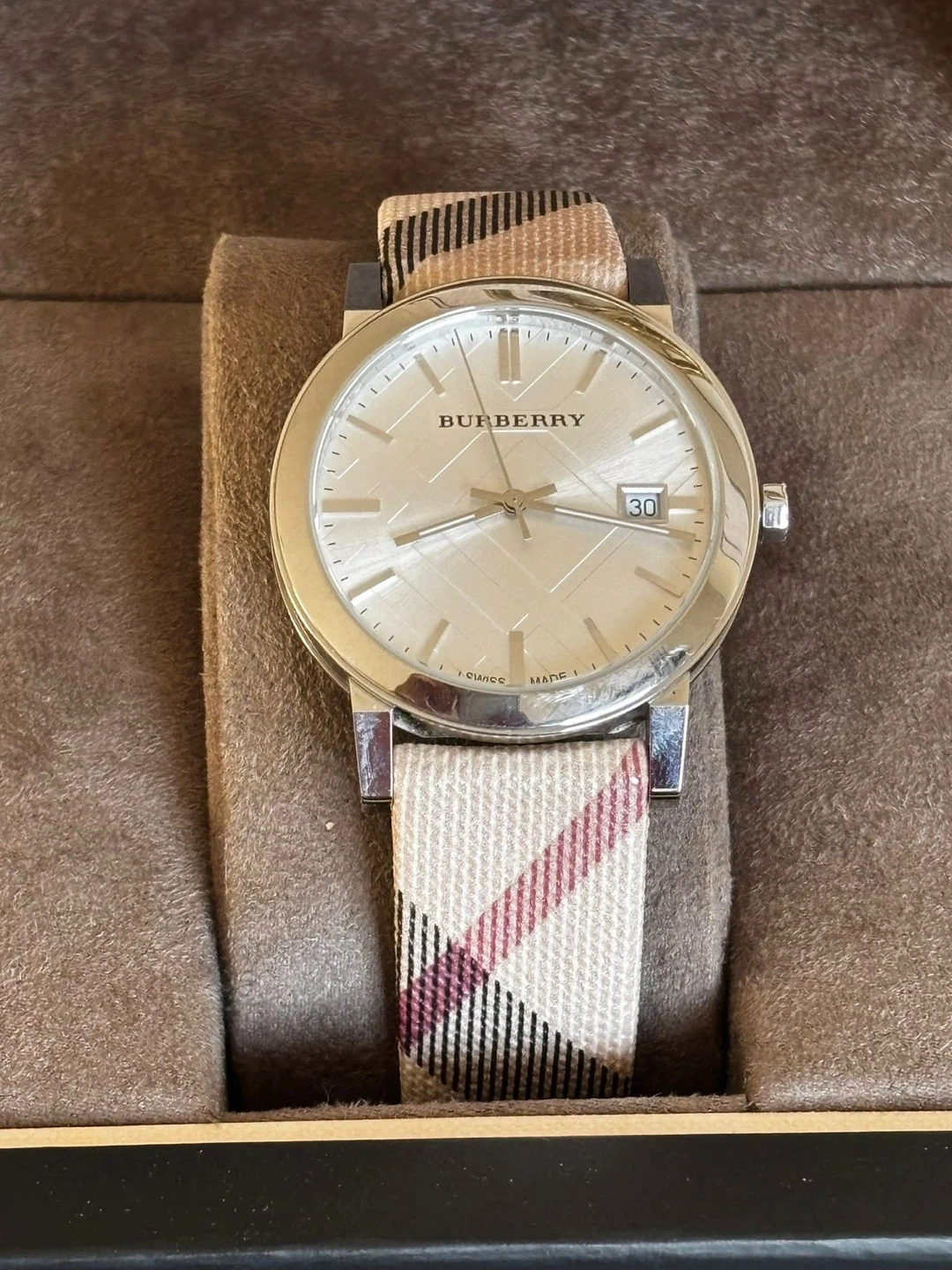 Selling a Burberry watch with a distinctive plaid strap. The watch features a silver-tone case and a date display. Comes with the original box, making it a great find for any watch enthusiast! Model : BU9022 Swiss Made Sapphire Crystal 50507 50M 165 feet water resistant Cash only
