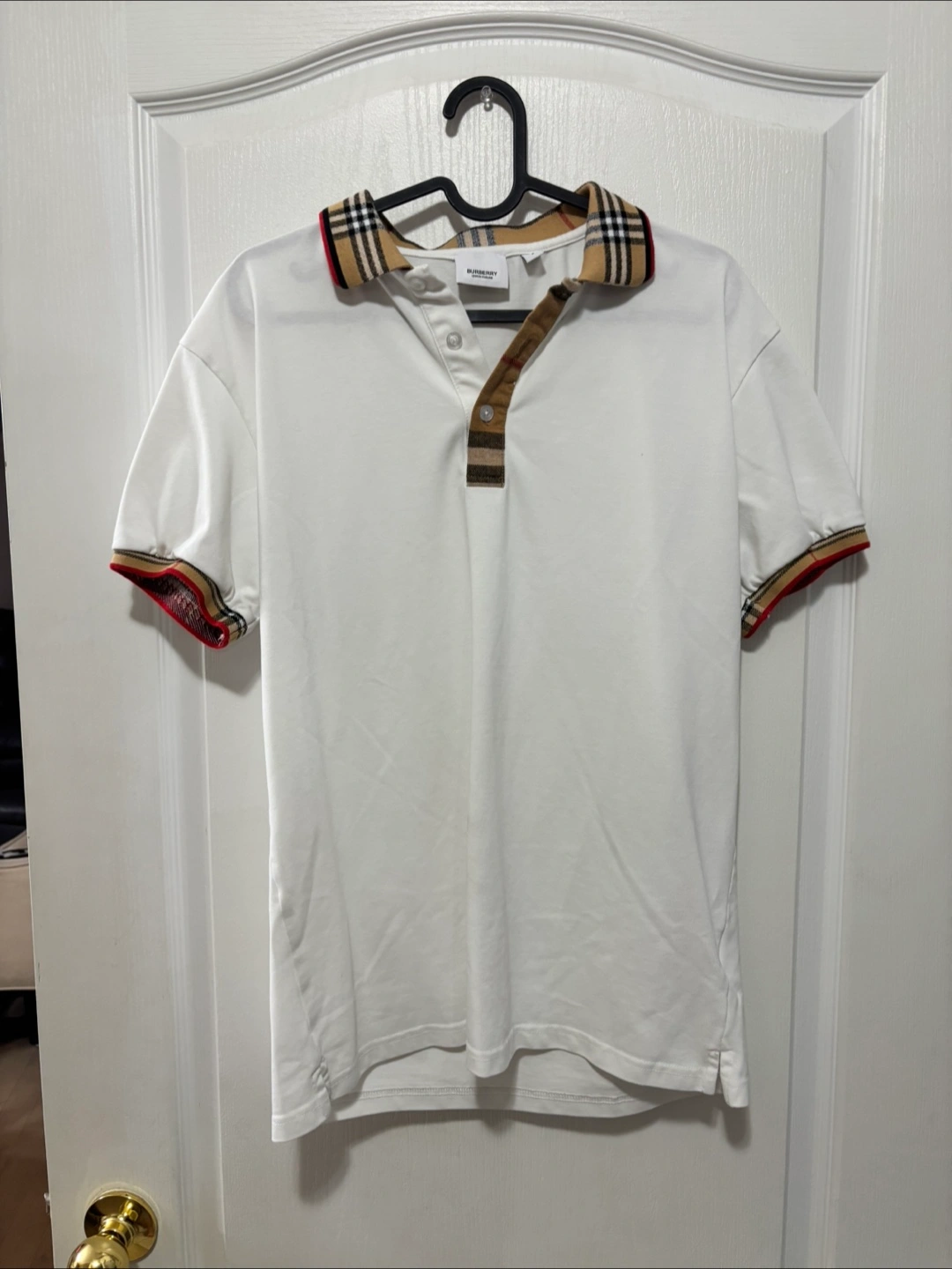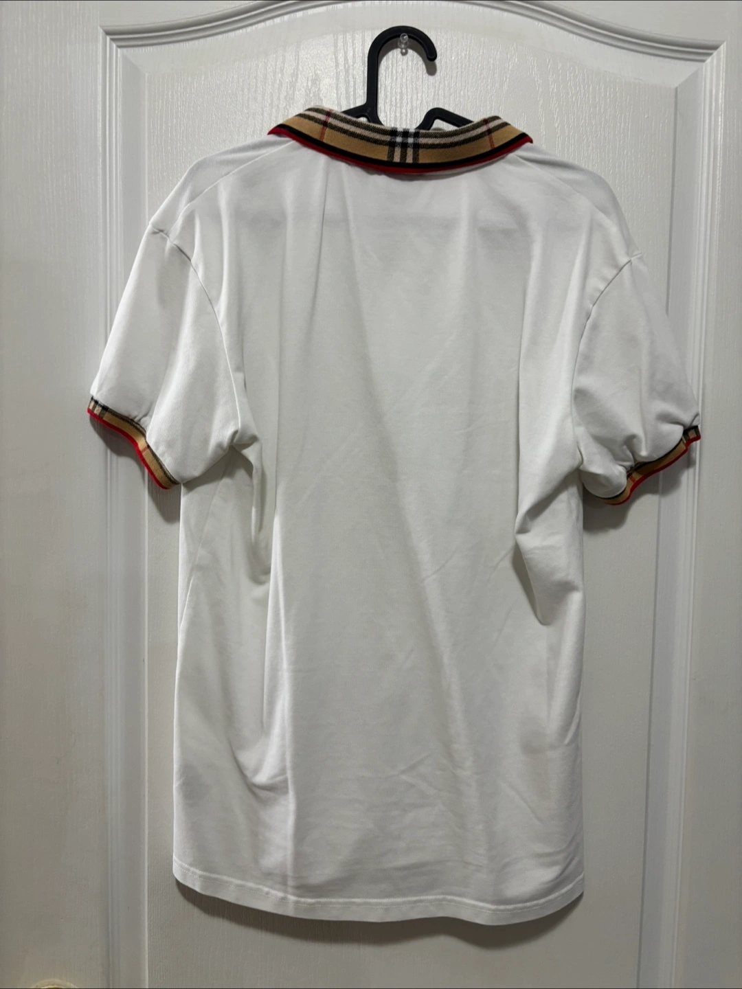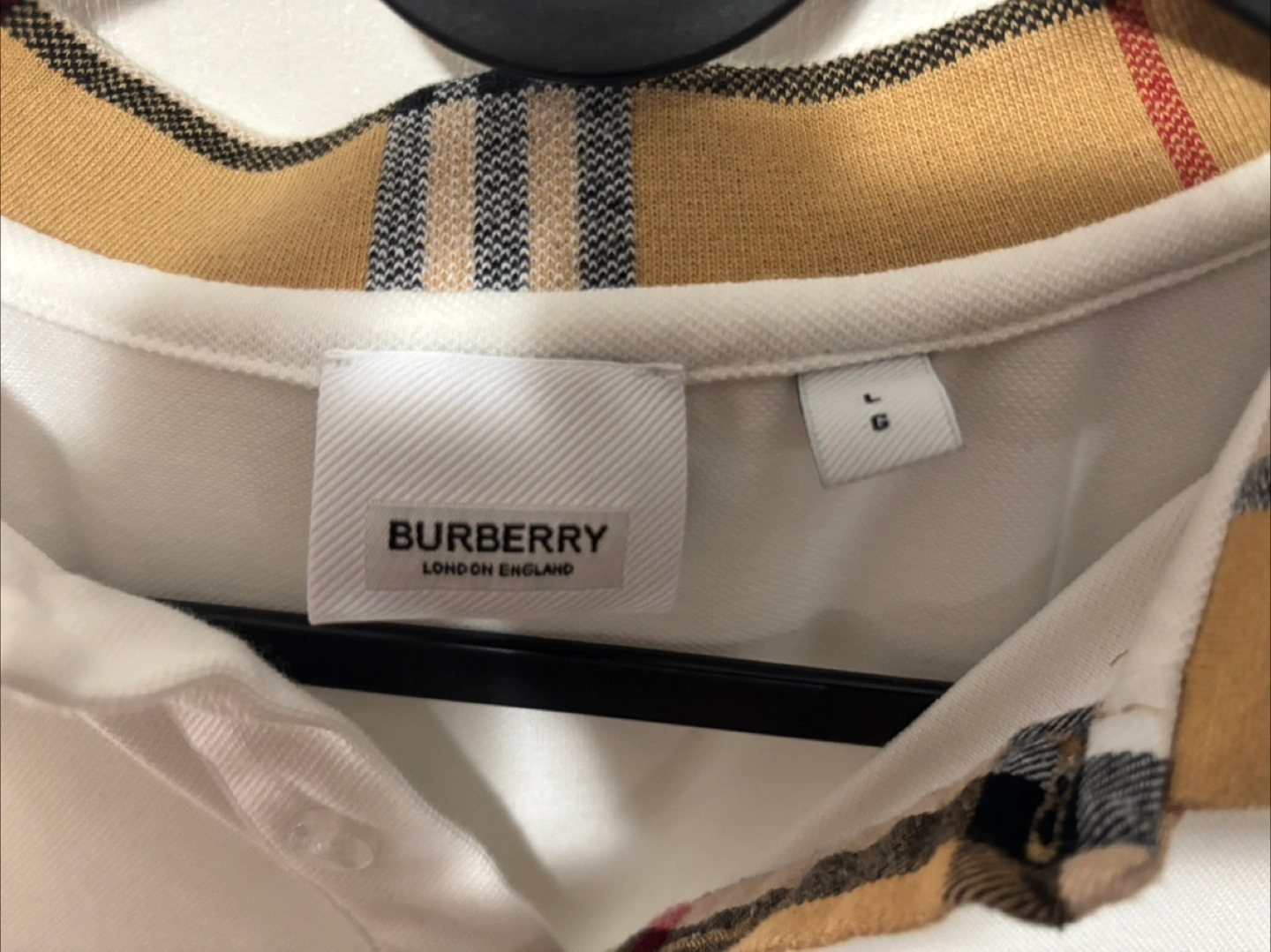 Here's a stylish Burberry polo shirt in white! It's a size L and features the classic Burberry check pattern on the collar and sleeves. Perfect for adding a touch of class to your wardrobe
