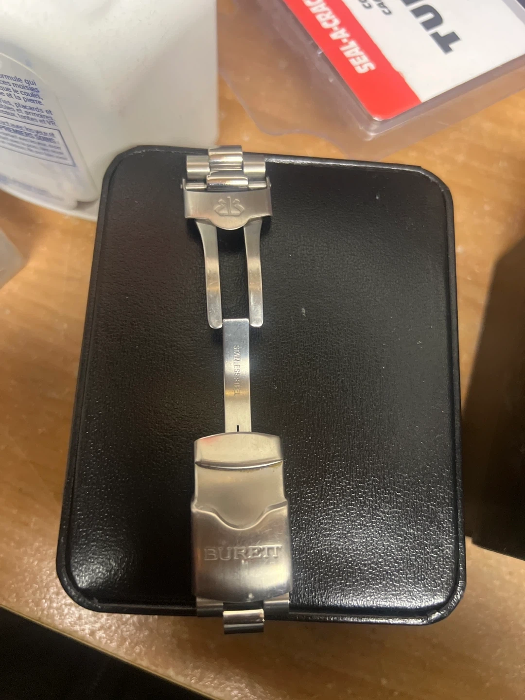 103Selling a Burett chronograph watch. It has a stainless steel band and is water resistant to 200 meters. The watch is in good condition, but band needs repair.