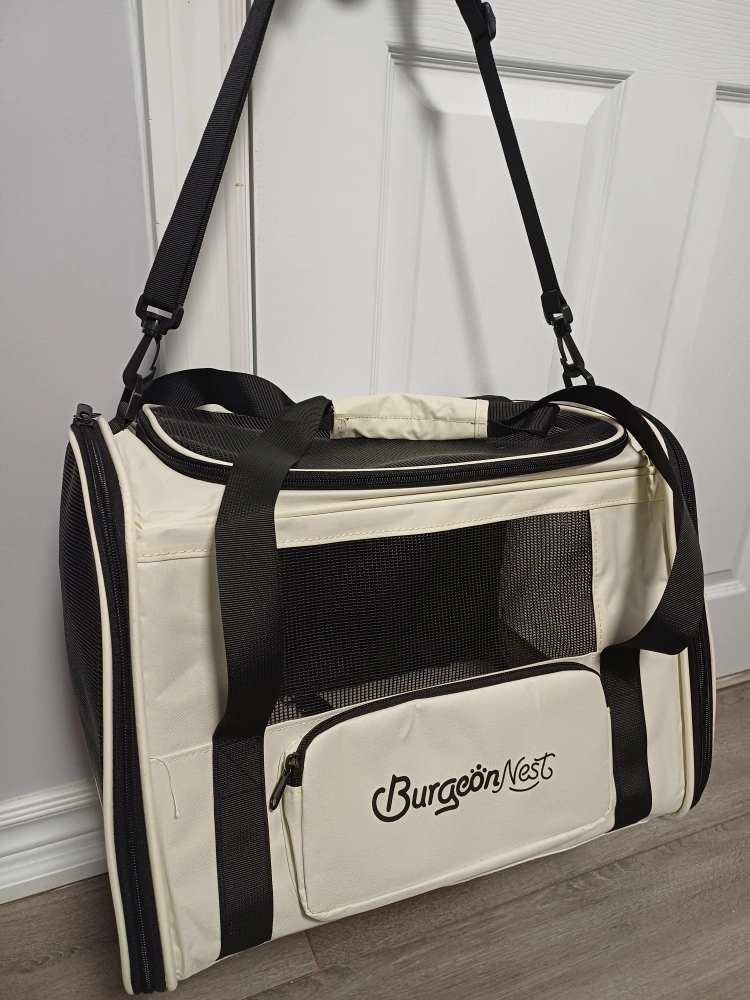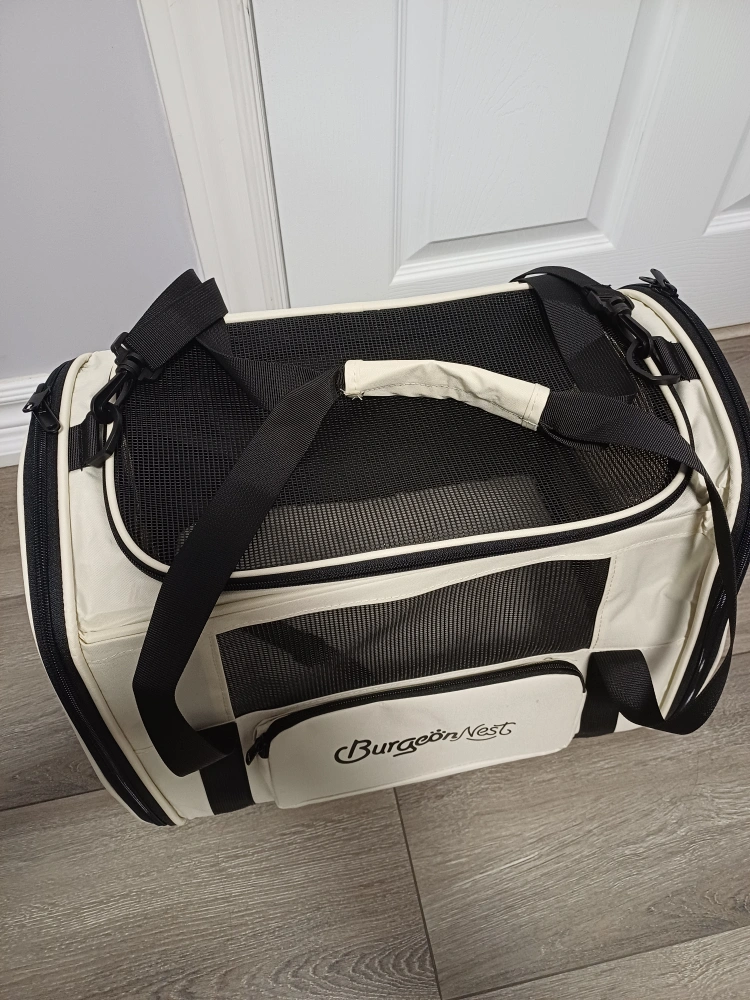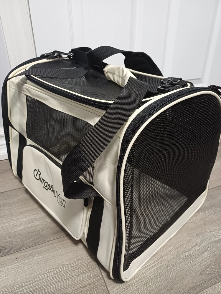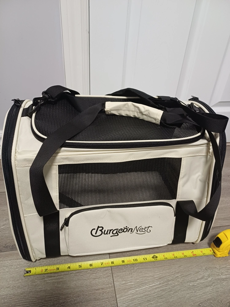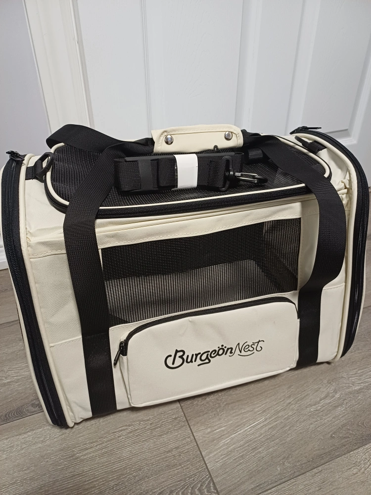 96Selling a brand new BurgeonNest pet carrier in beige and black! It's in great shape and ready for your furry friend. The carrier has mesh windows for ventilation and easy viewing. It measures approximately 17 inches long, 12 inches in width and 13 inches in height. Perfect for cats and dogs upto 20 lbs or 9kgs.๐