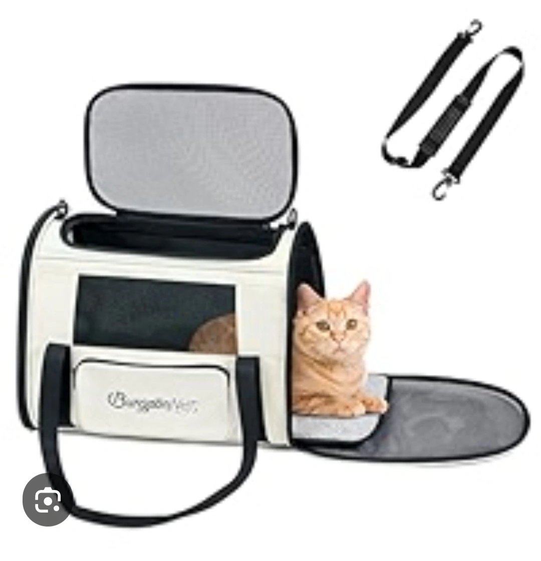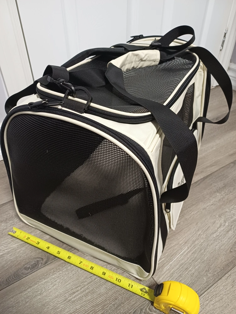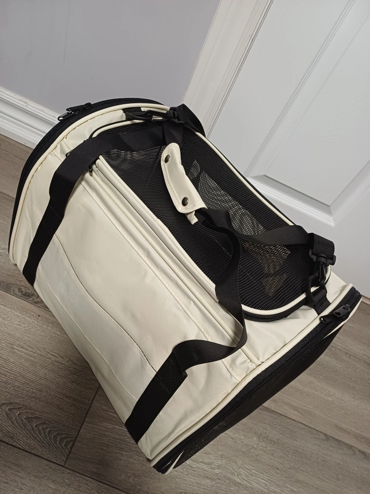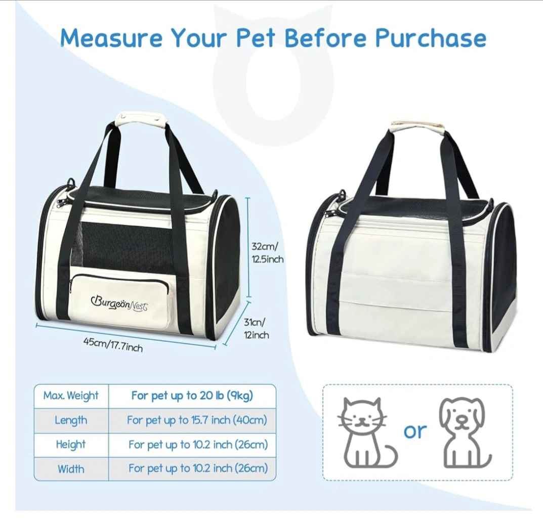 96Selling a brand new BurgeonNest pet carrier in beige and black! It's in great shape and ready for your furry friend. The carrier has mesh windows for ventilation and easy viewing. It measures approximately 17 inches long, 12 inches in width and 13 inches in height. Perfect for cats and dogs upto 20 lbs or 9kgs.๐