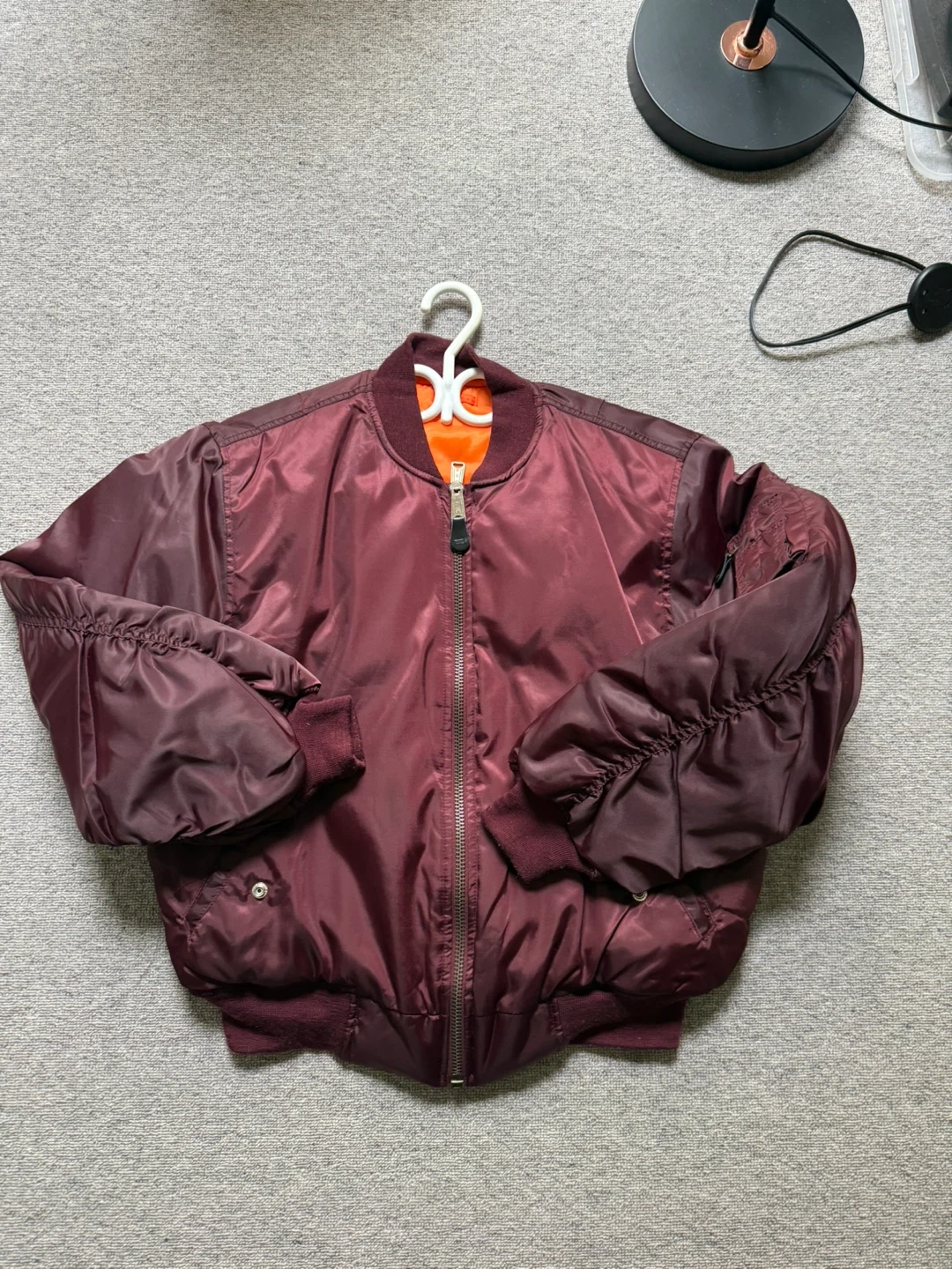 Selling a burgundy bomber jacket in good condition! It has a classic bomber style with a zip-up front and a small pocket on the sleeve. The jacket is a nice, deep burgundy colour with orange lining. Size small oversized worn once