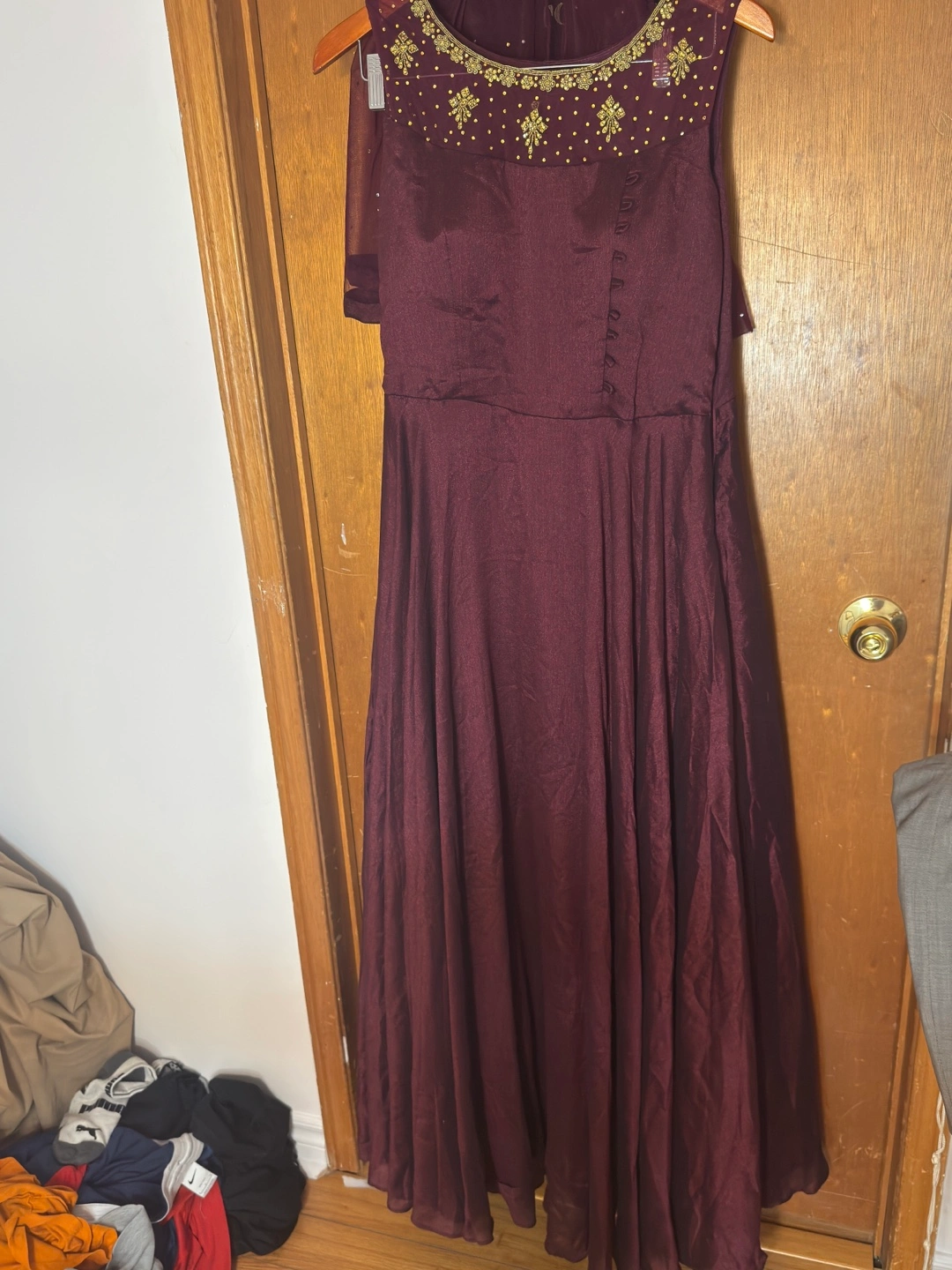 A beautiful burgundy dress with delicate gold embroidery around the neckline and upper bodice. It appears to be in good condition and ready for a new home! The dress features a flowing skirt, perfect for a special occasion or a night out