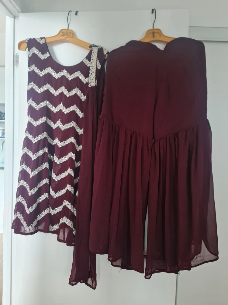 10Selling a lovely burgundy dress indian gharara set with silver chevron detailing. It's in great condition and ready for a new home!