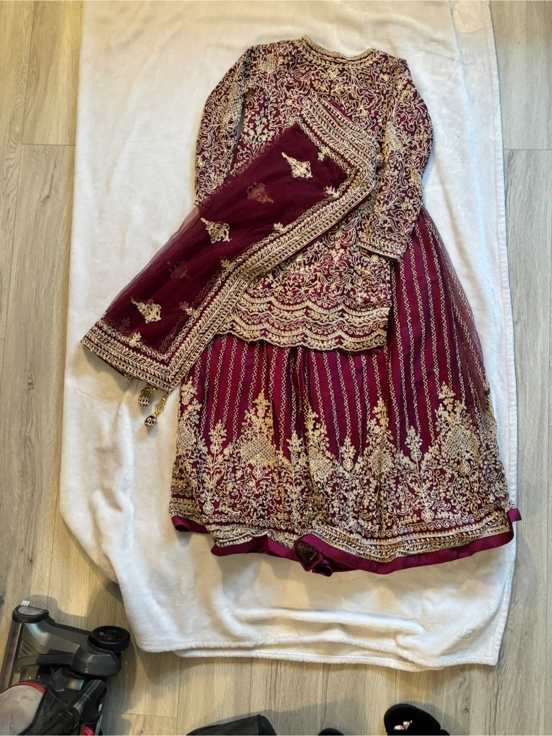 60Beautiful burgundy lehenga choli set with intricate gold embroidery. Includes the skirt (lehenga), top (choli), and dupatta (scarf). Perfect for weddings or special occasions!