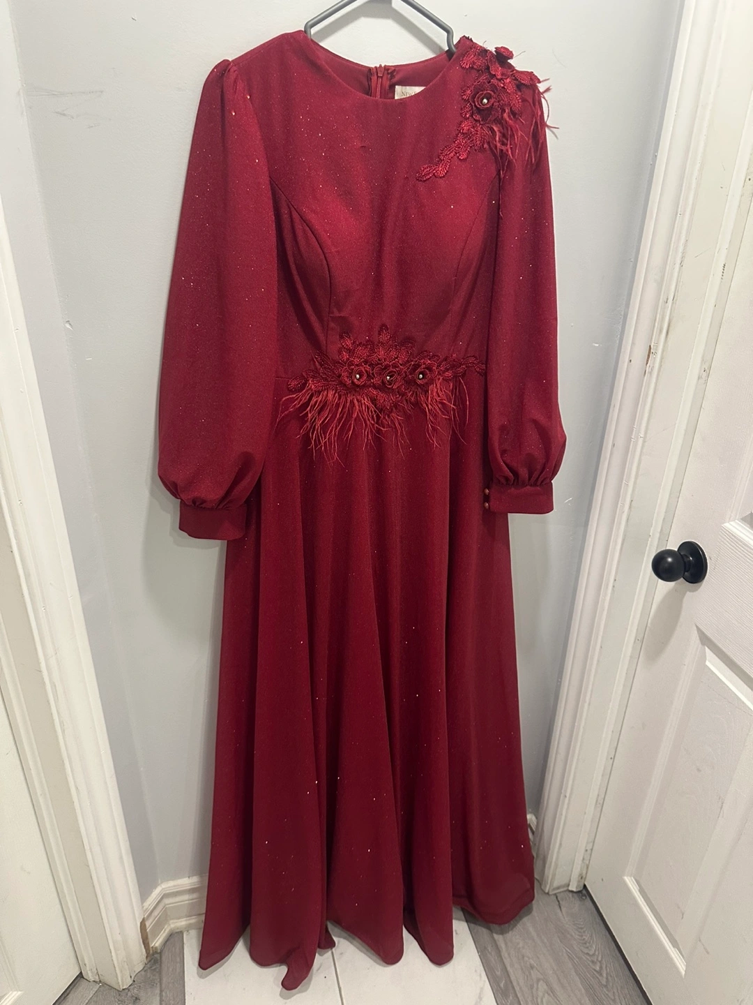 10Elegant burgundy gown. Features long sleeves and decorative details with feathers and beads. Great for special events, where you can feel and look your best.