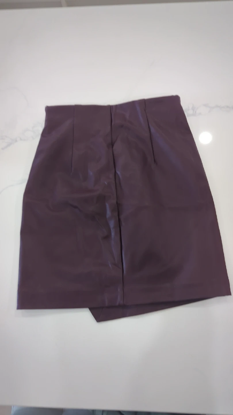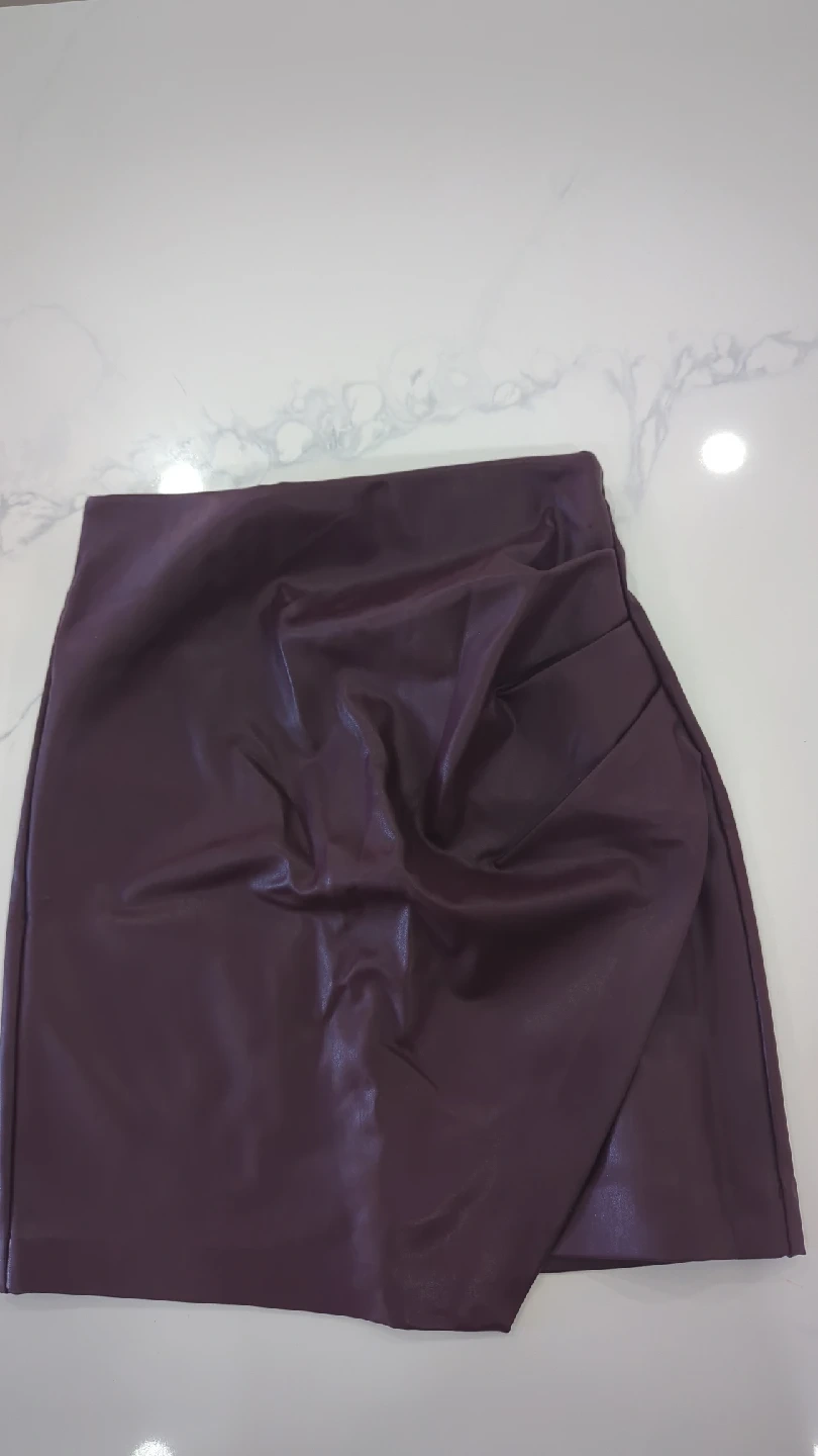 65A stylish burgundy mini skirt made of faux leather. It's in great condition and ready for a new home! The size isn't marked, but it fits like a small to medium. The unique wrap design adds a touch of flair to any outfit